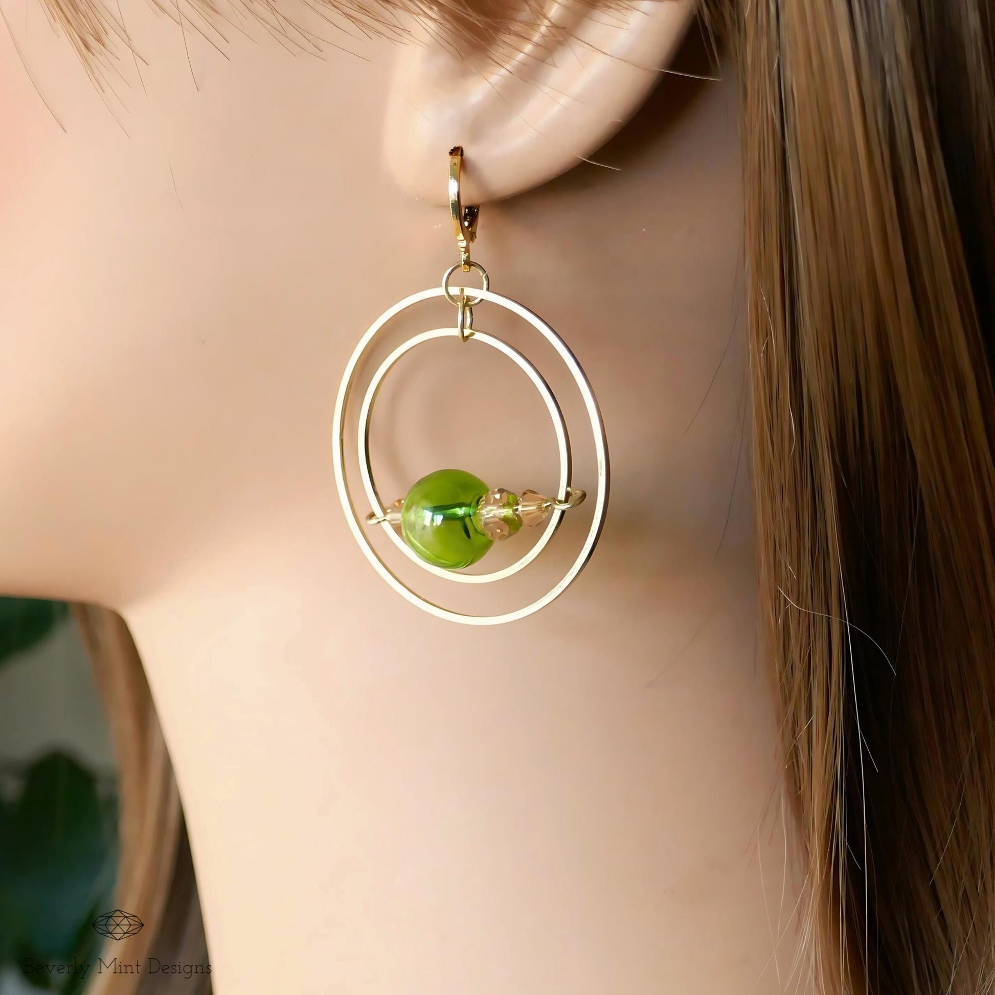 18K Gold Glass Ball Earrings, Green Drop Earrings, Dangle Long Earrings, Unique Glass Ball Earrings, Dangle Earrings, Drop Earrings