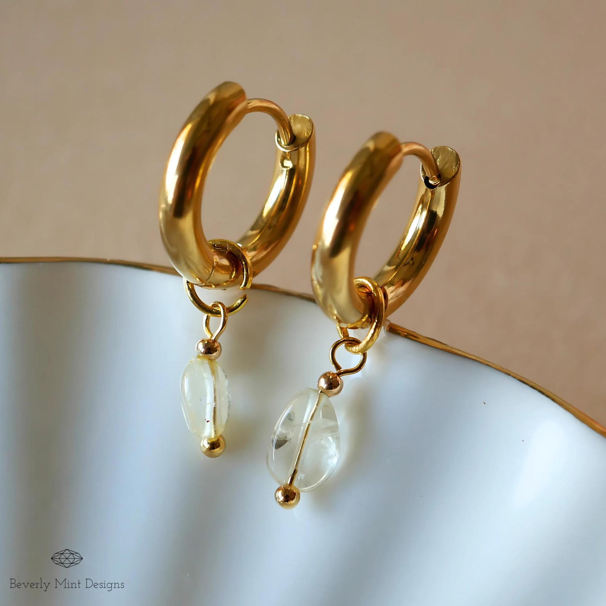 18K Gold Tiny Natural Stone Earrings, White Crystal Stone Earrings, Minimalist Dangle Earrings, Boho Chic Hoops, Delicate Stone Jewelry