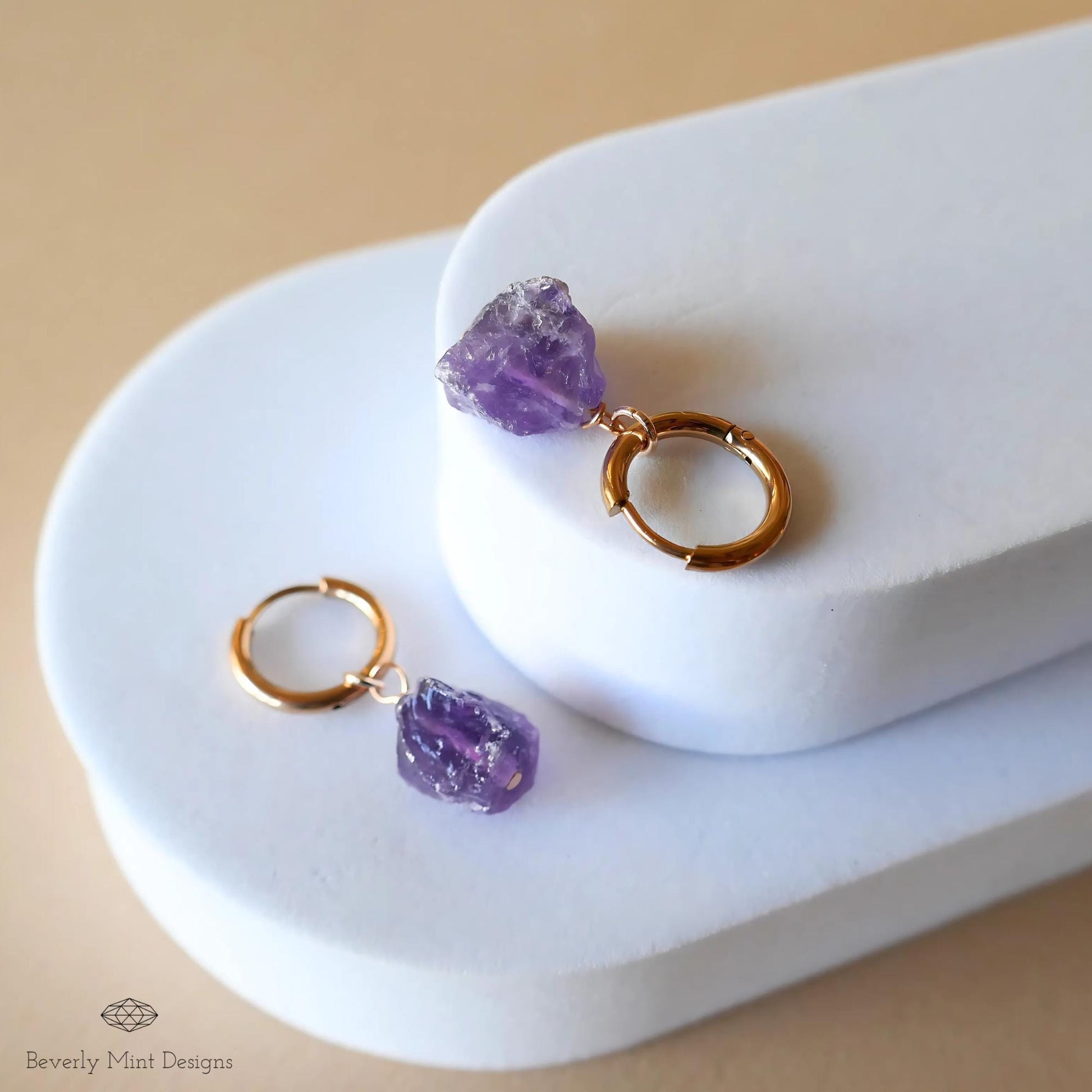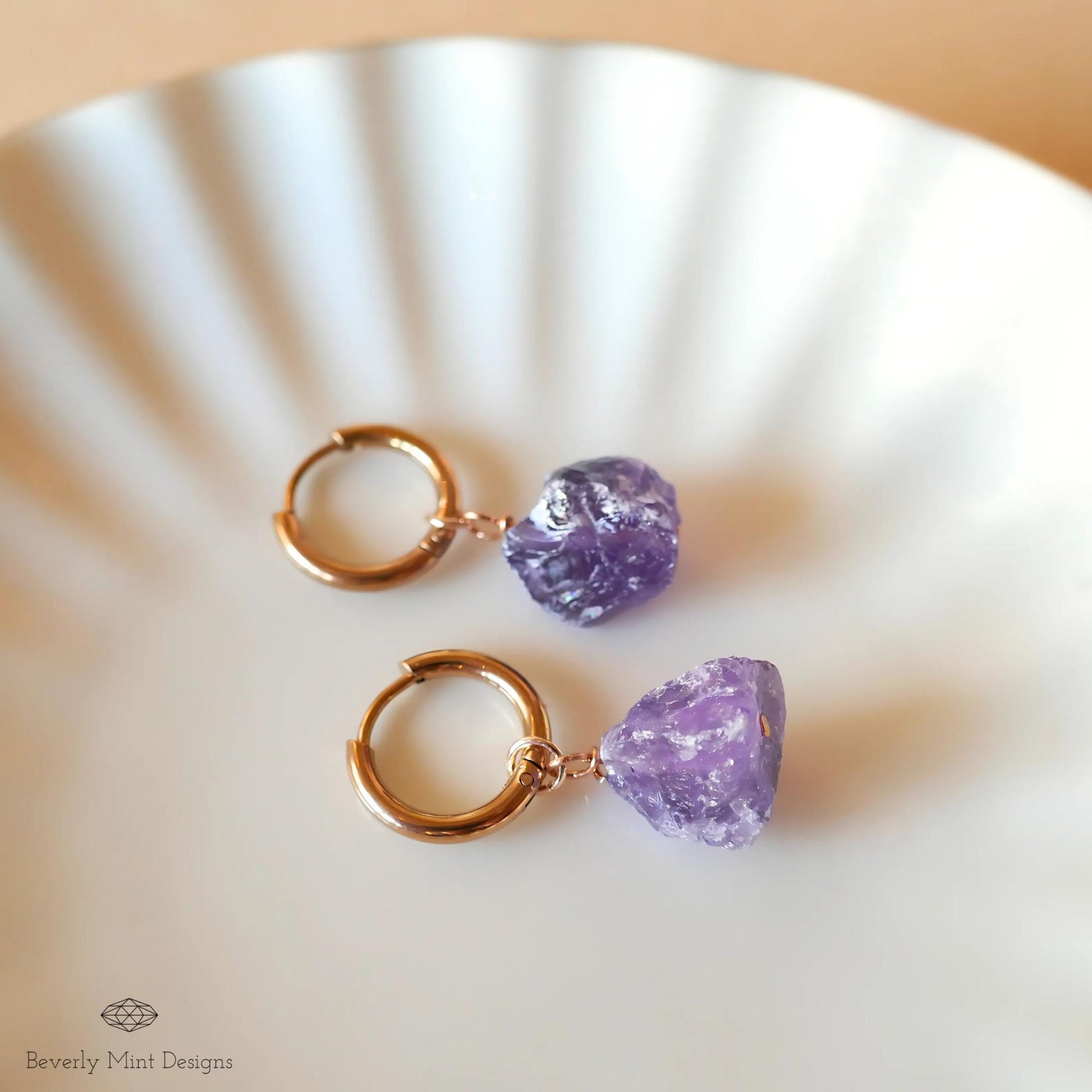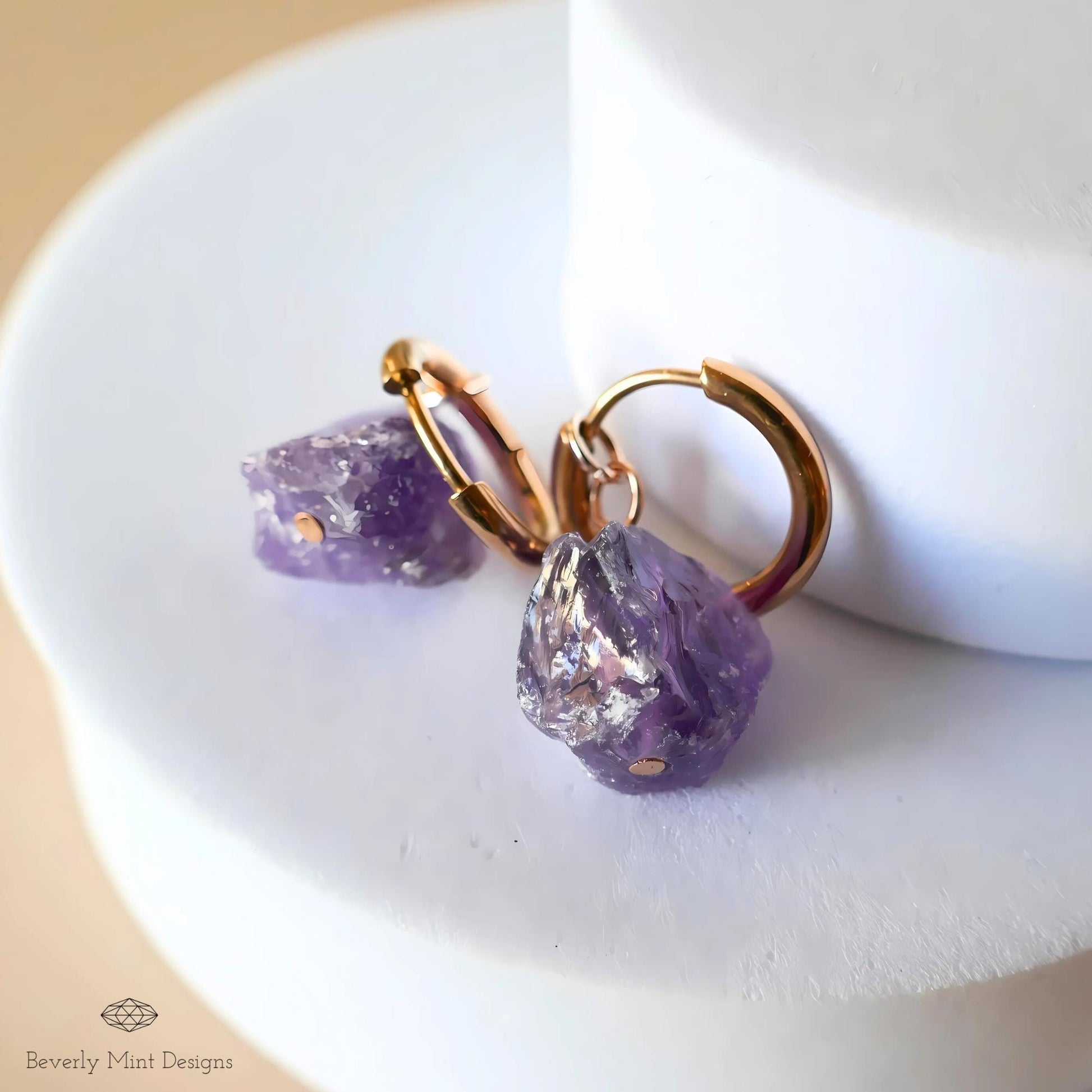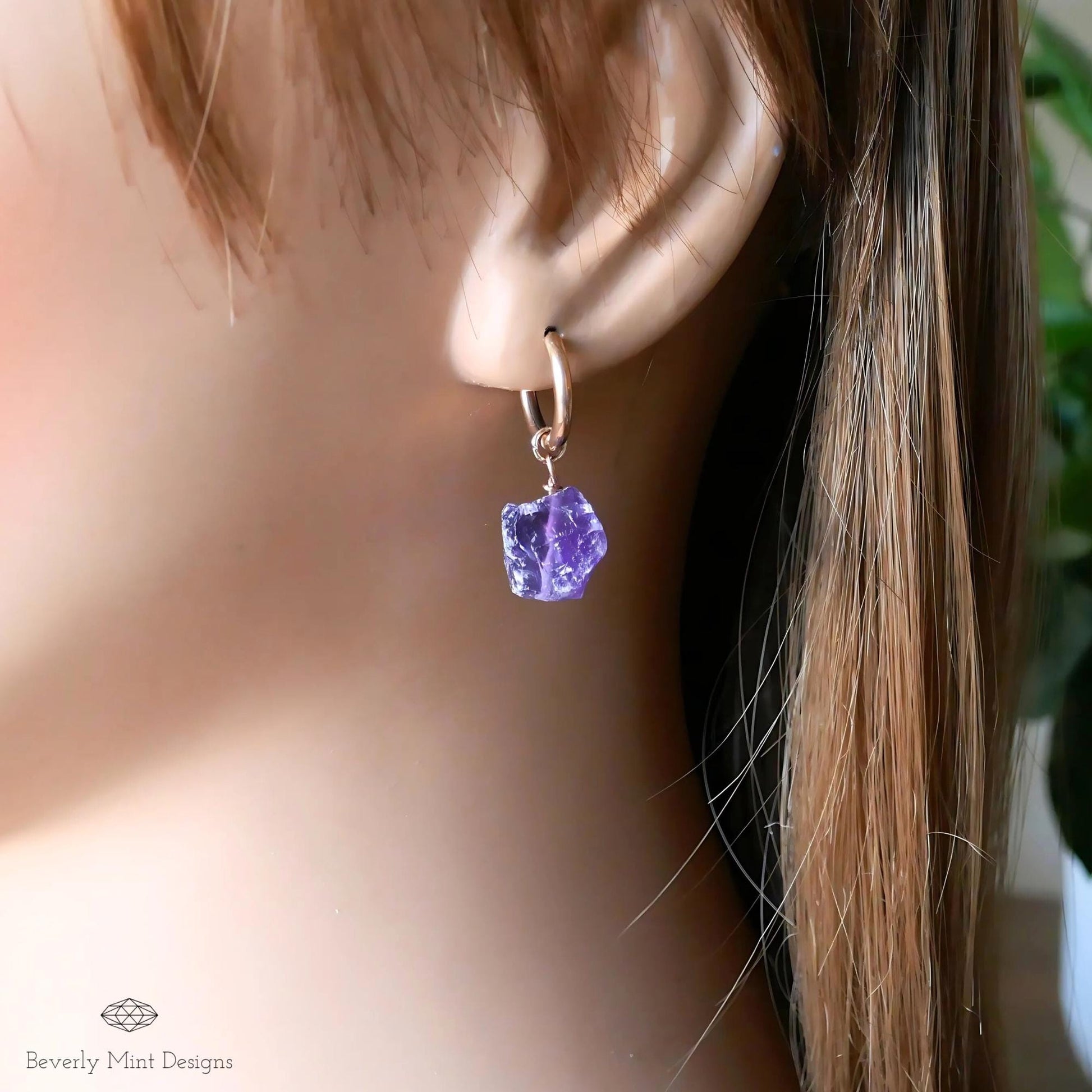 Amethyst Earrings, Rose Gold Huggie Hoop Earrings with February Birthstone, Raw Amethyst Stone Earrings ,Chakra Stone Gift, Gift For Her