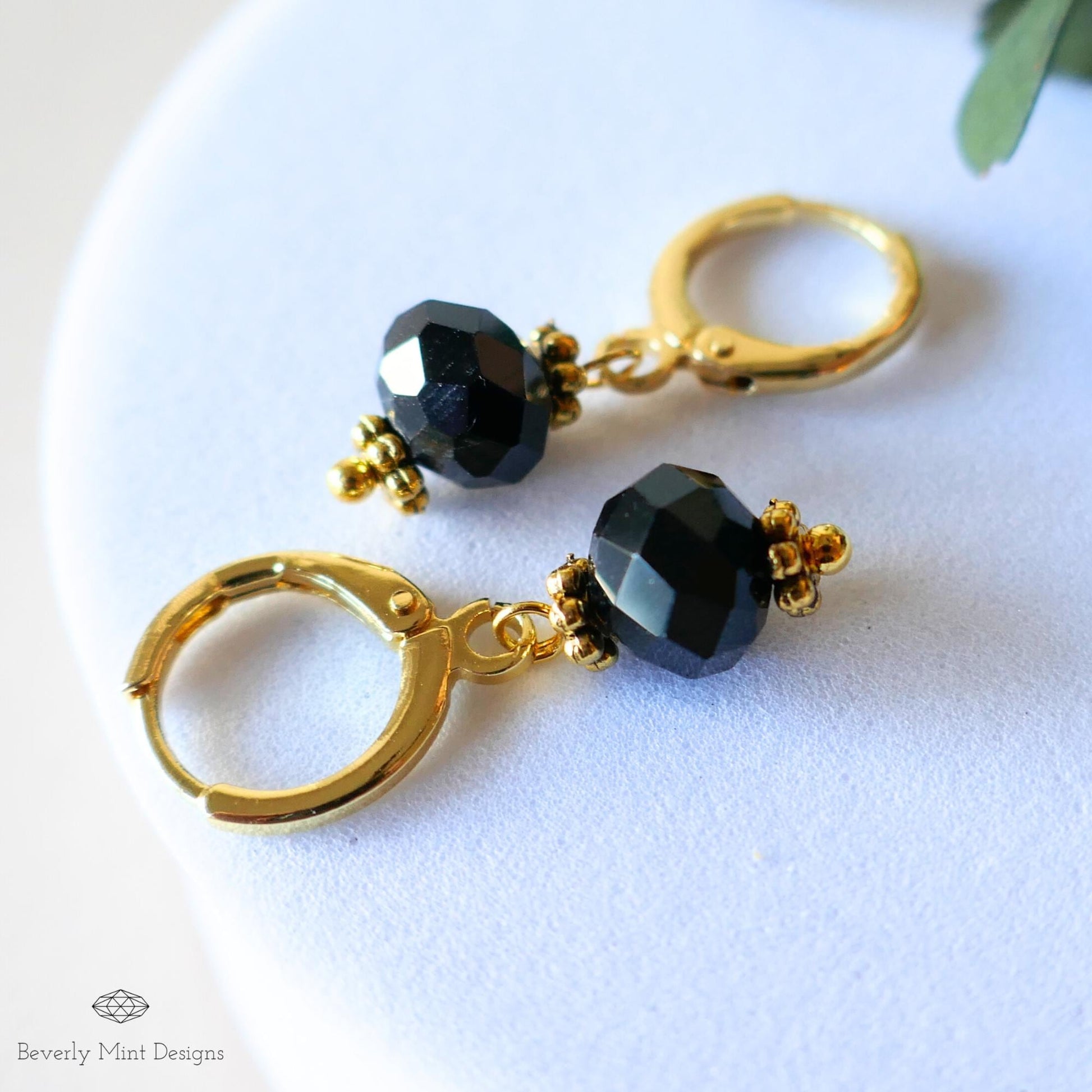Black Bead Drop Earrings, Gold Huggie Hoop Earrings, Dainty Black Earrings, Minimalist Jewelry, Gift for Her, Evening Earrings, Light Weight