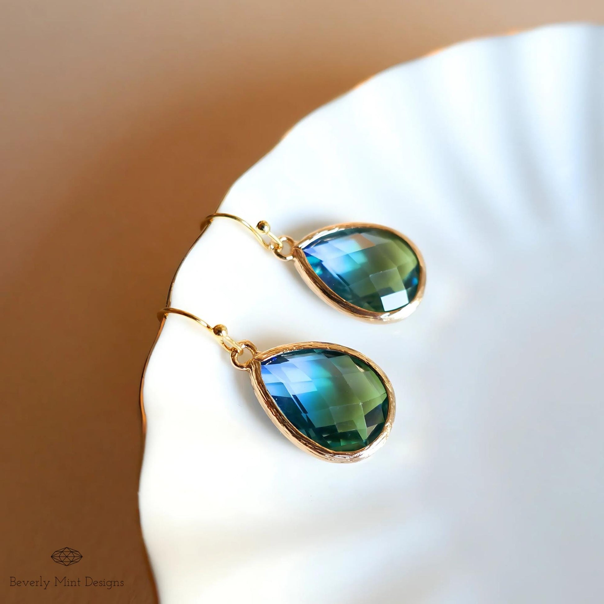 Blue and Green Teardrop Earrings, Blue Ombre Gemstone Drop Earrings, Elegant Teardrop Earrings, Handmade Gradient Crystal Drop Earrings