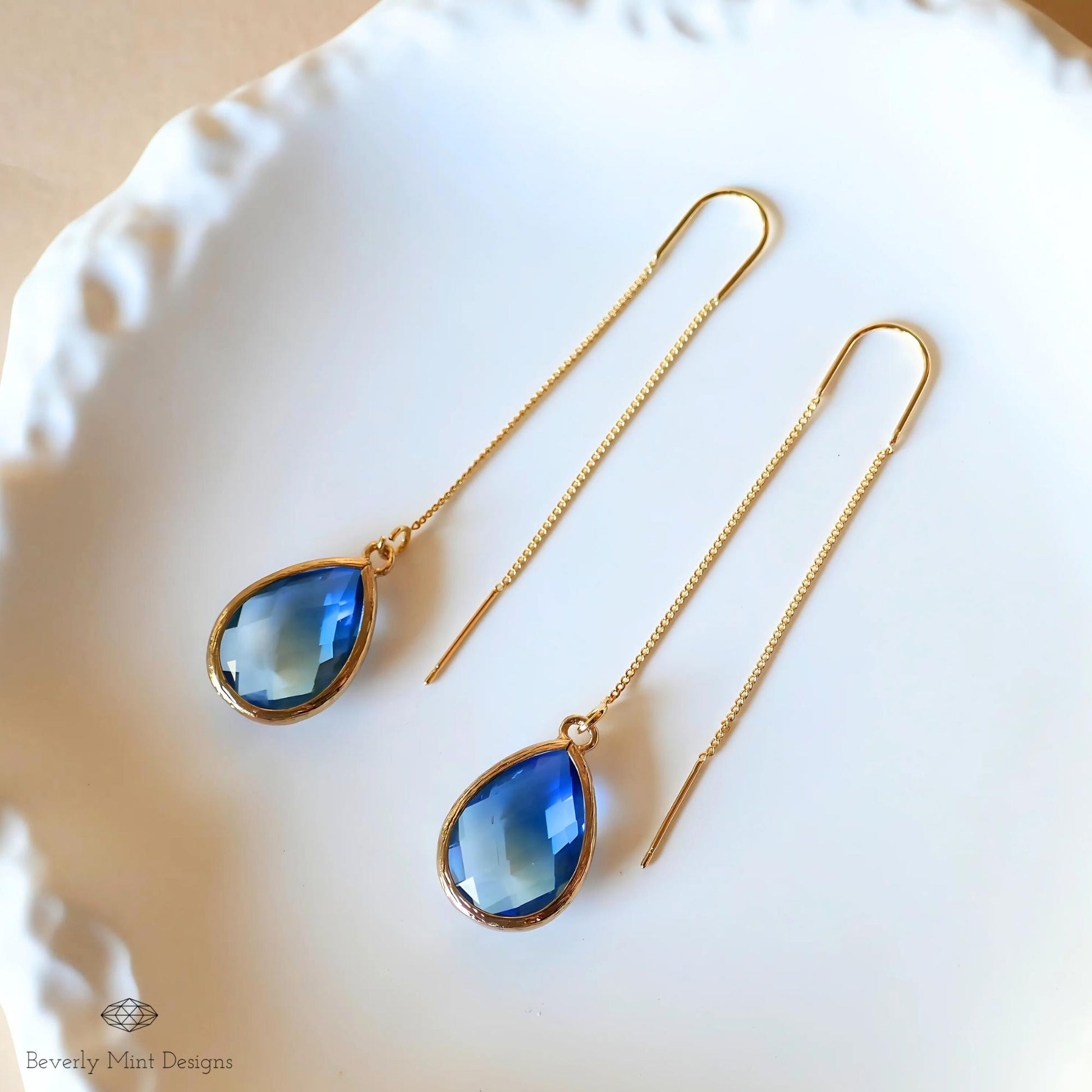 Blue and Green Teardrop Earrings, Blue Ombre Gemstone Threader Earrings, Elegant Teardrop Earrings, Handmade Gradient Crystal Drop Earrings