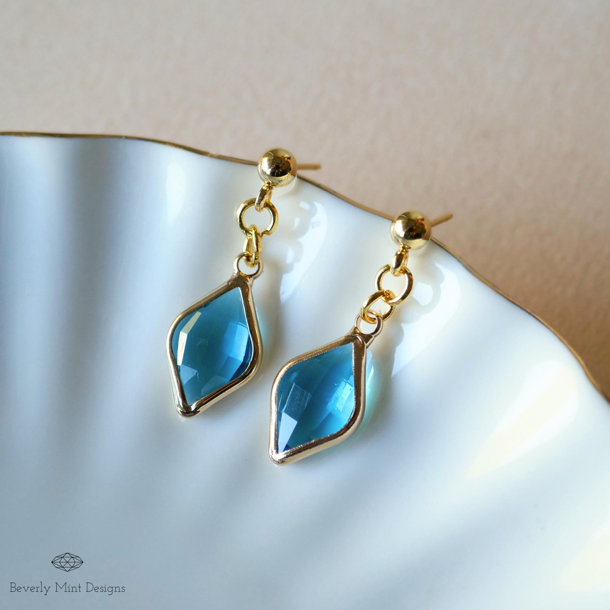 Blue Crystal Stud Earrings , Gold Minimalist Dangle Earrings , Small Drop Earrings for Women ,Something Blue Earrings, Handmade Jewelry Gift