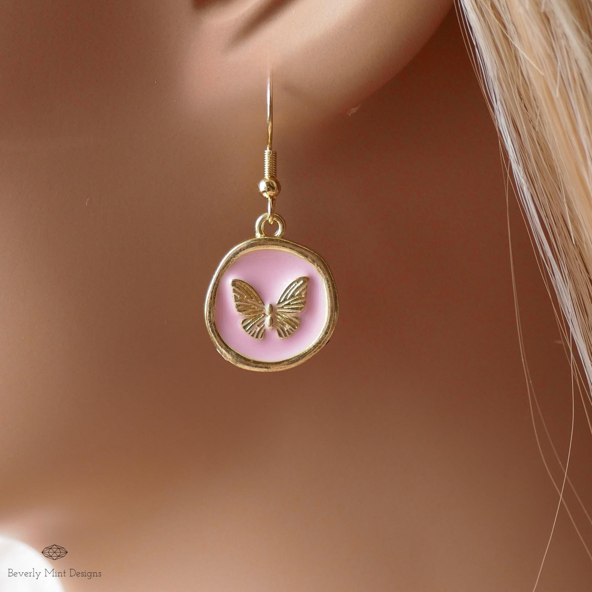 Butterfly Enamel Charm Earrings, Pink Dangle Earrings, Handmade Vintage Butterfly Jewelry, Nature Inspired Gift for Her