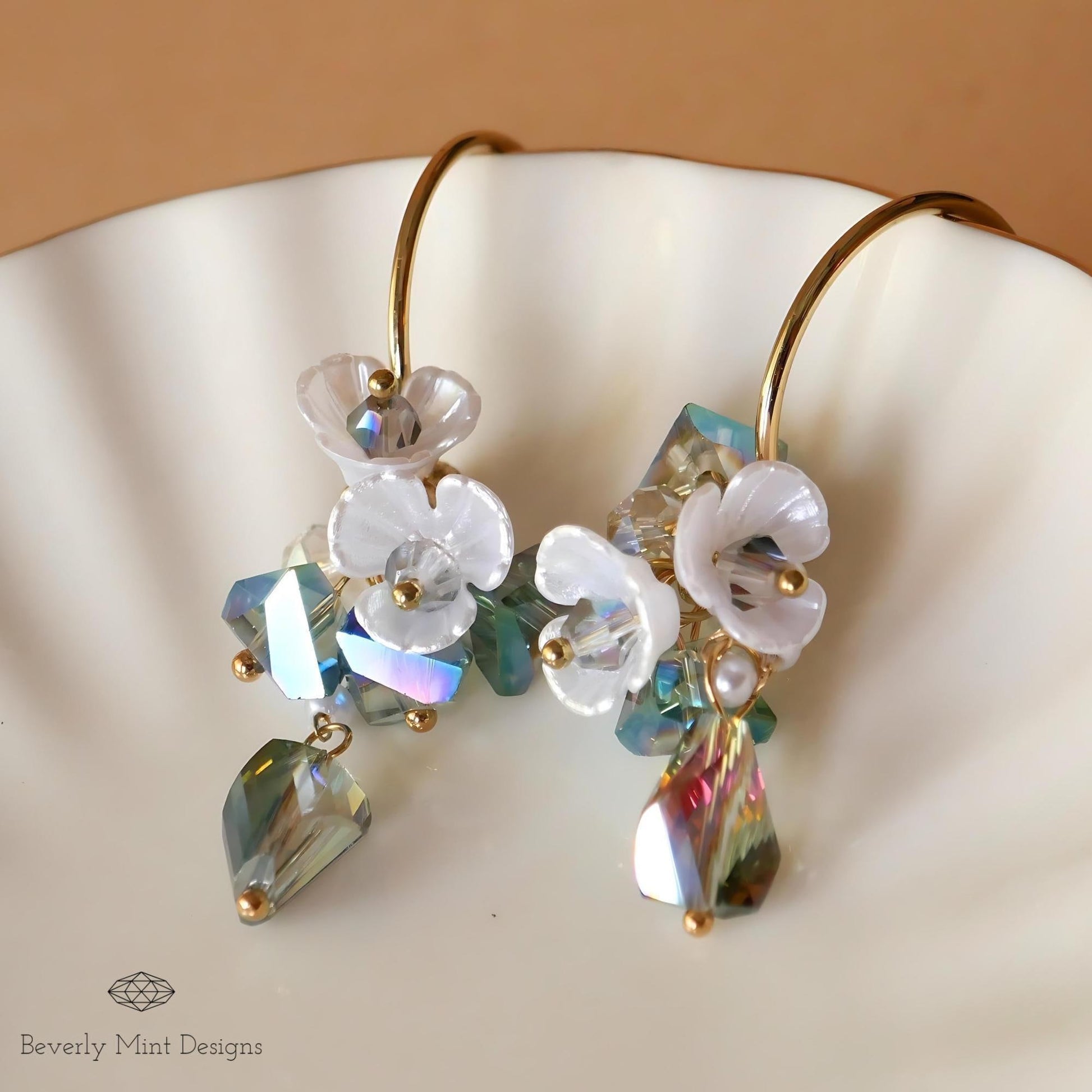 Dangle Flower Earrings , Pearly Floral Earrings, Green Beads Earrings, Gift For Her