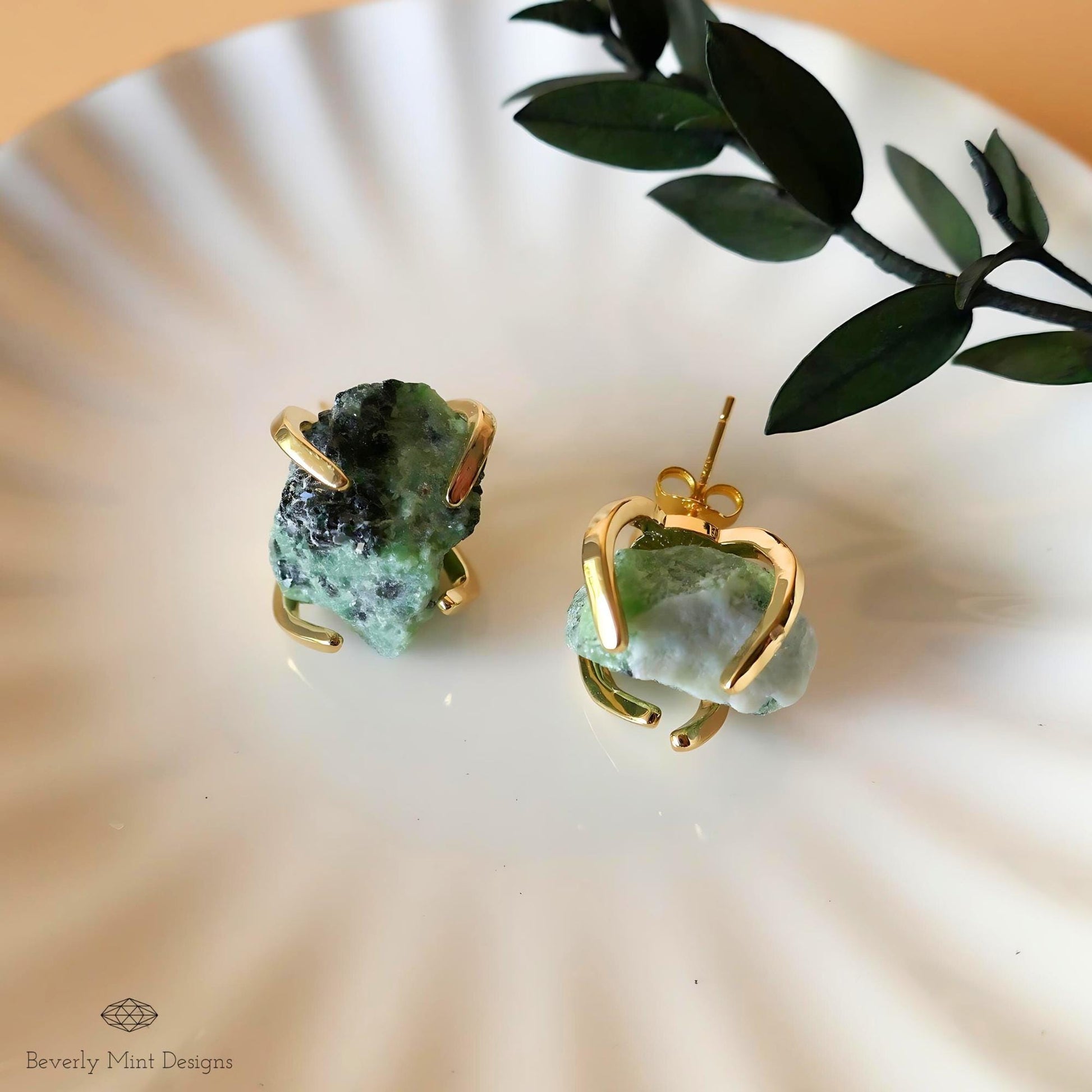Epidote Stud Earrings with 18K Gold, Green Stone Earrings, 1/2 - 3/4 inches, Natural Raw Stone Earrings, Heart Chakra Stone