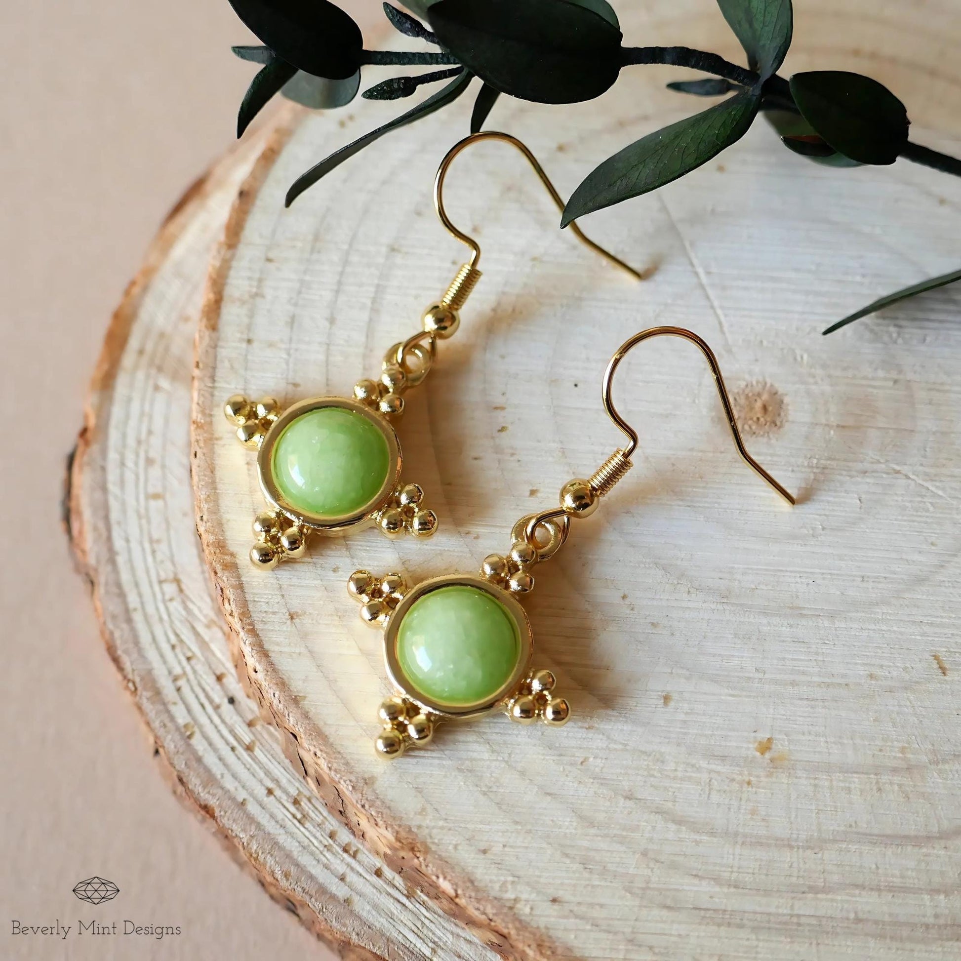 Gold and Green Dangle Earrings with Beaded Accents Boho Chic Handmade Jewelry for Women, Bohemian earrings, Unique jewelry, Gift for her