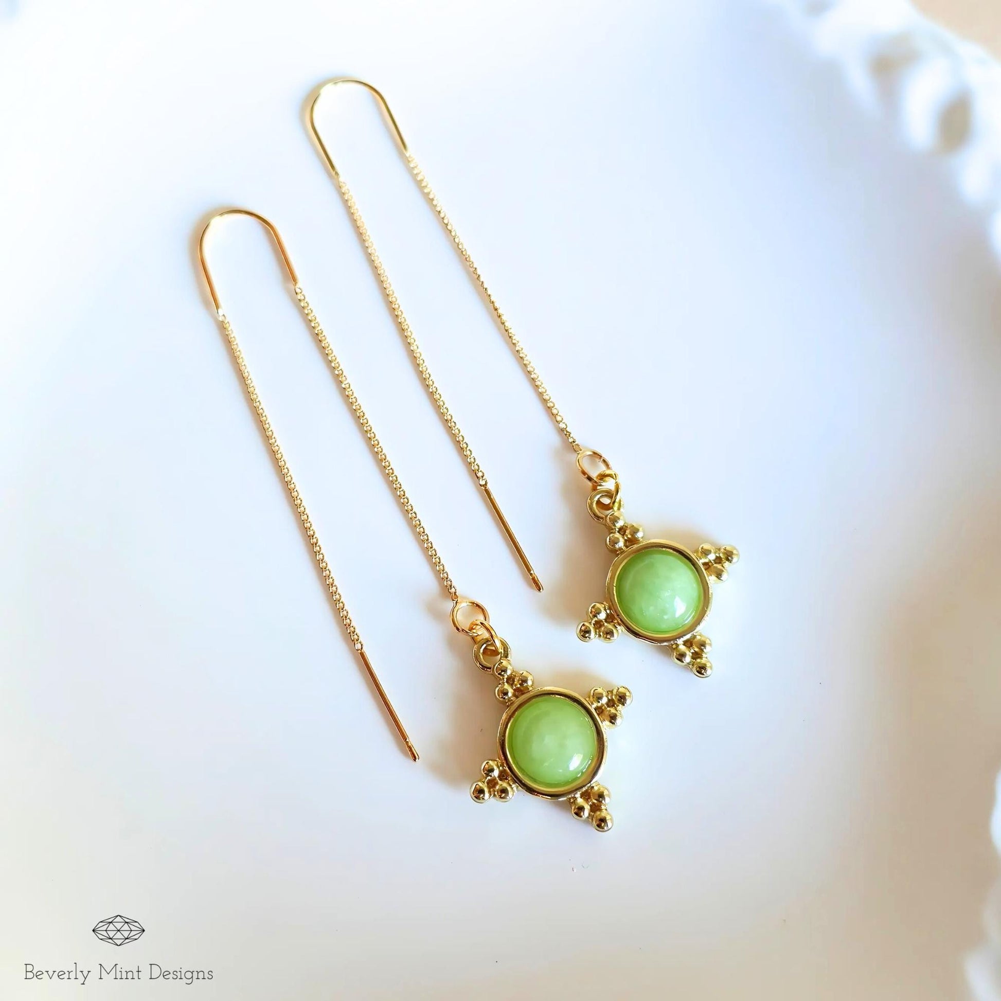 Gold and Green Dangle Earrings with Beaded Accents Boho Chic Handmade Jewelry for Women, Bohemian threader earrings, Jade Color
