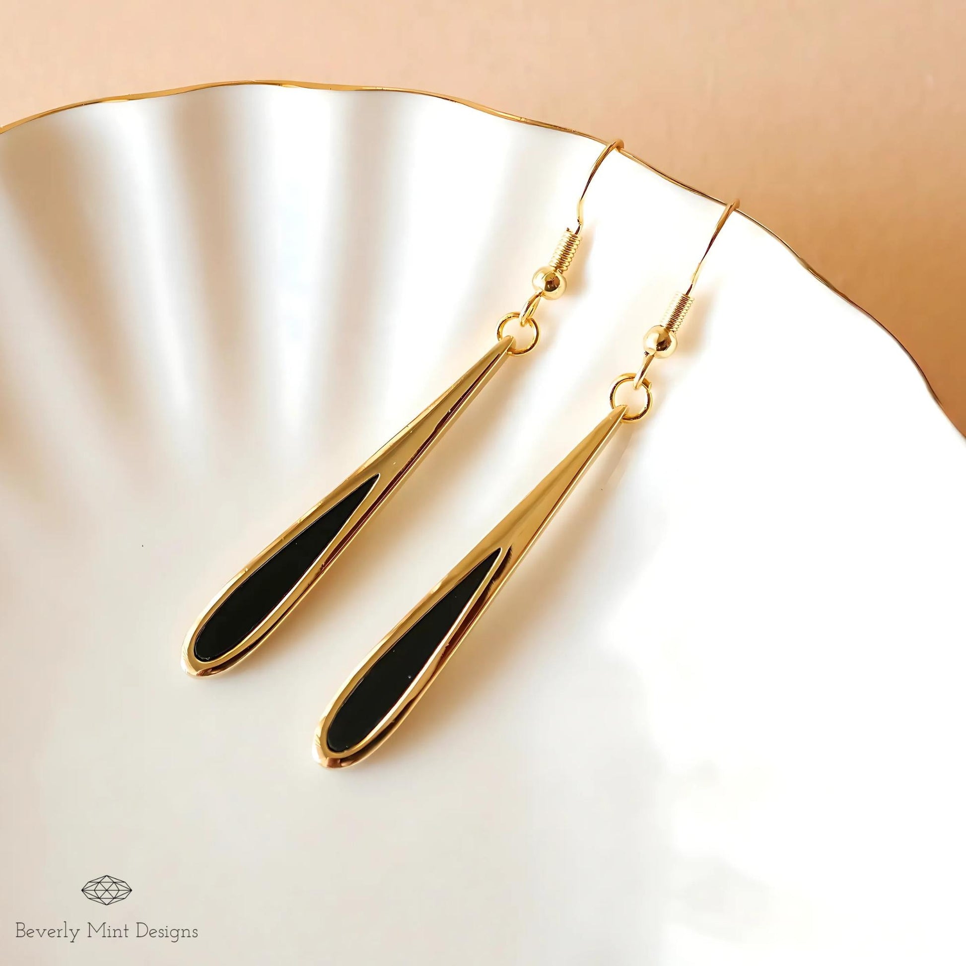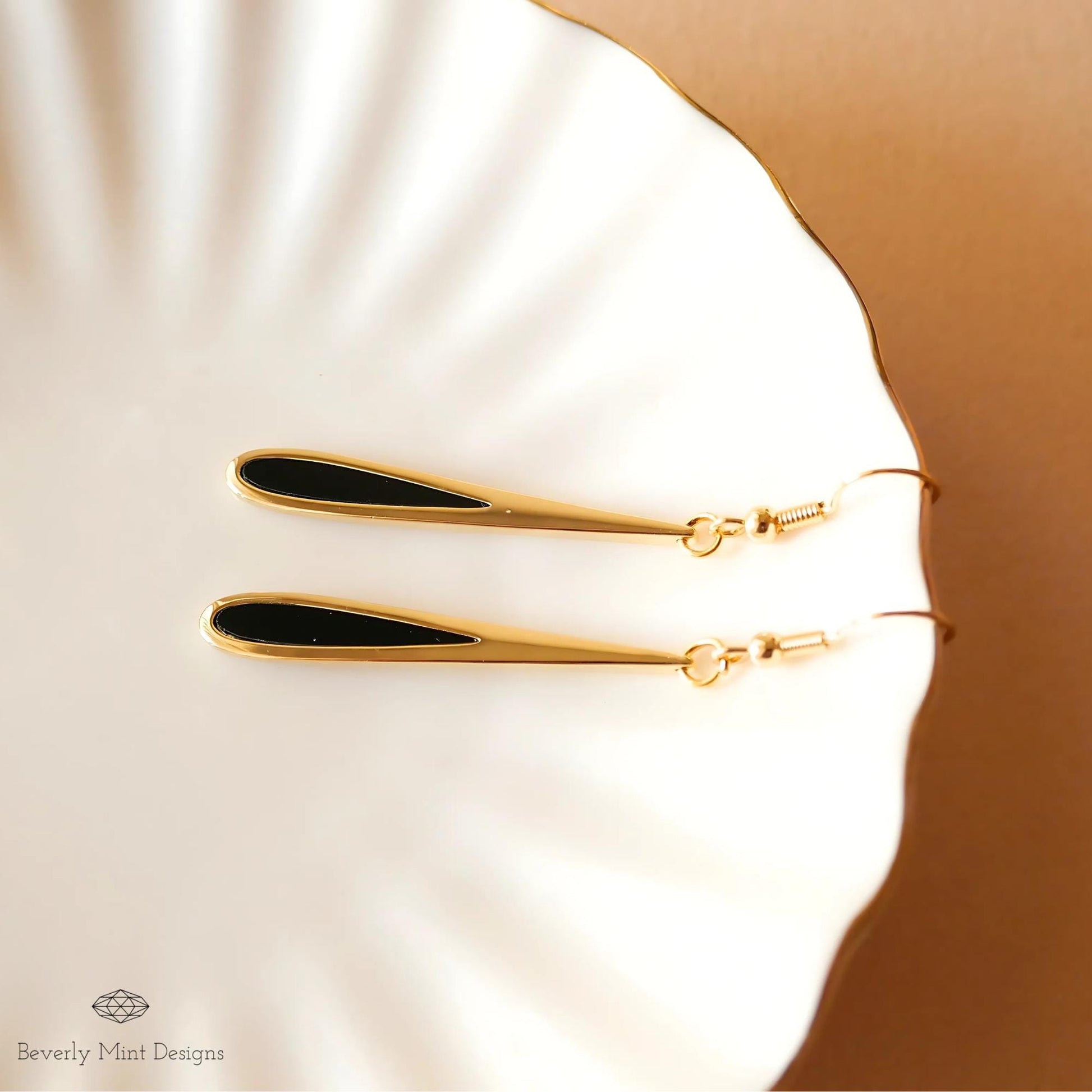 Gold Black Teardrop Dangle Earrings, Minimalist Long Drop Earrings, Elegant Statement Jewelry, Sleek Geometric Earrings, Modern Gift for Her