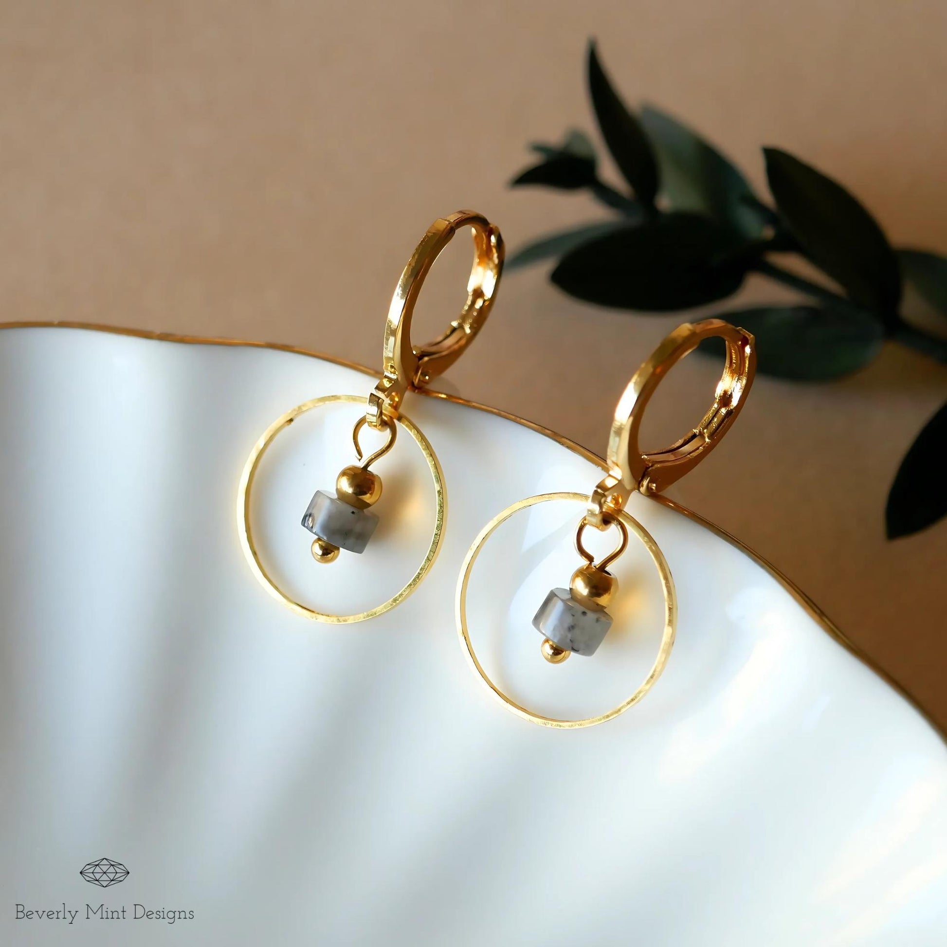 Gold Circle Hoop Earrings with Stone Charm, Minimalist Geometric Dangle Hoops, Modern Statement Jewelry, Elegant Gift for Her