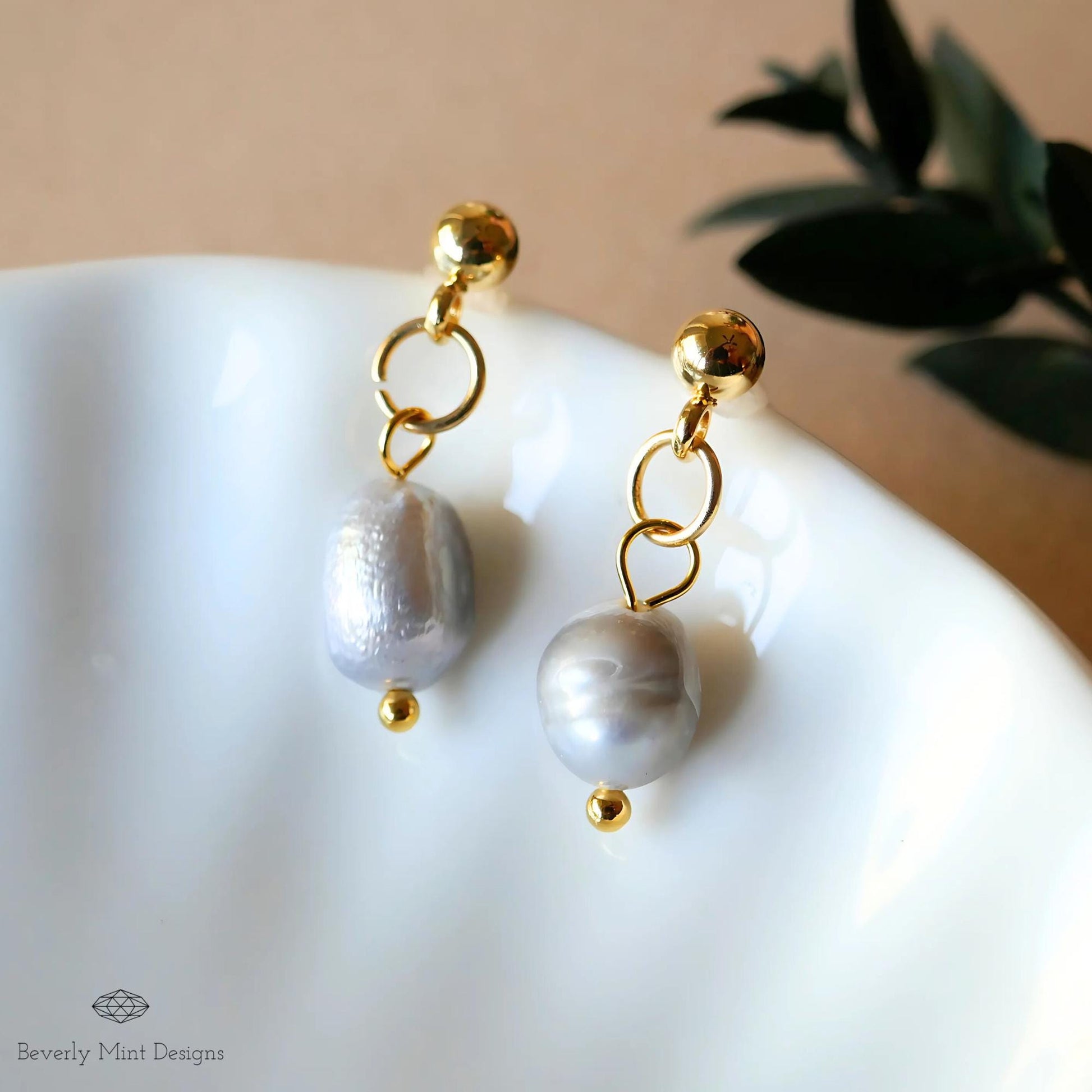 Gold Drop Earrings with Gray Baroque Pearl Beads, Minimalist Grey Pearl Dangle Earrings, Elegant Statement Jewelry, Unique, Gift For Her