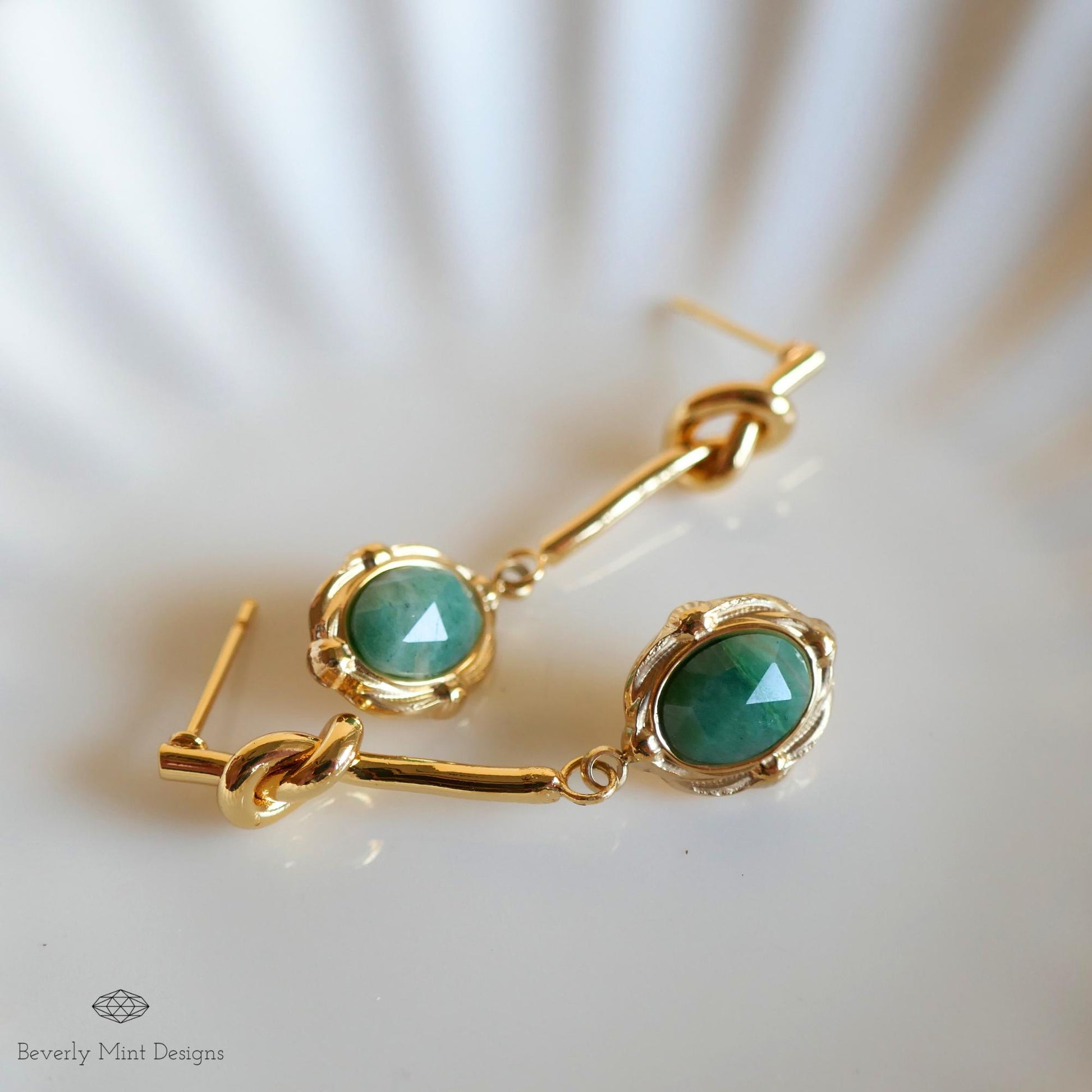 Gold Drop Earrings with Green Gemstone ,Vintage-Style Dangle Earrings , Elegant Knot Design Jewelry for Women ,Gift for Her