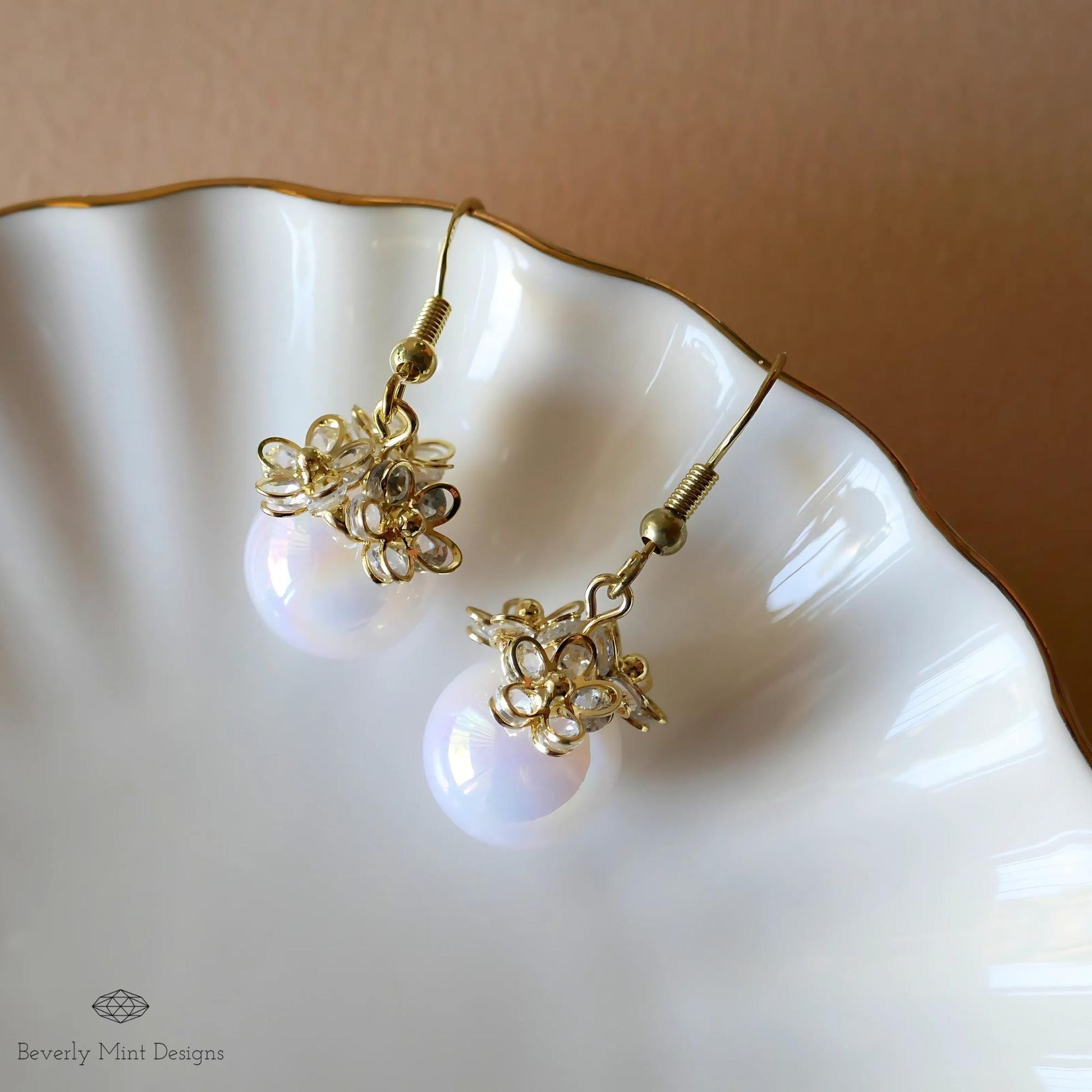 Gold Flower Pearly Drop Earrings, Floral Dangle Earrings with 18K Gold , Flower Jewelry, Iridescent Opal Bead Earrings, Gift for Her