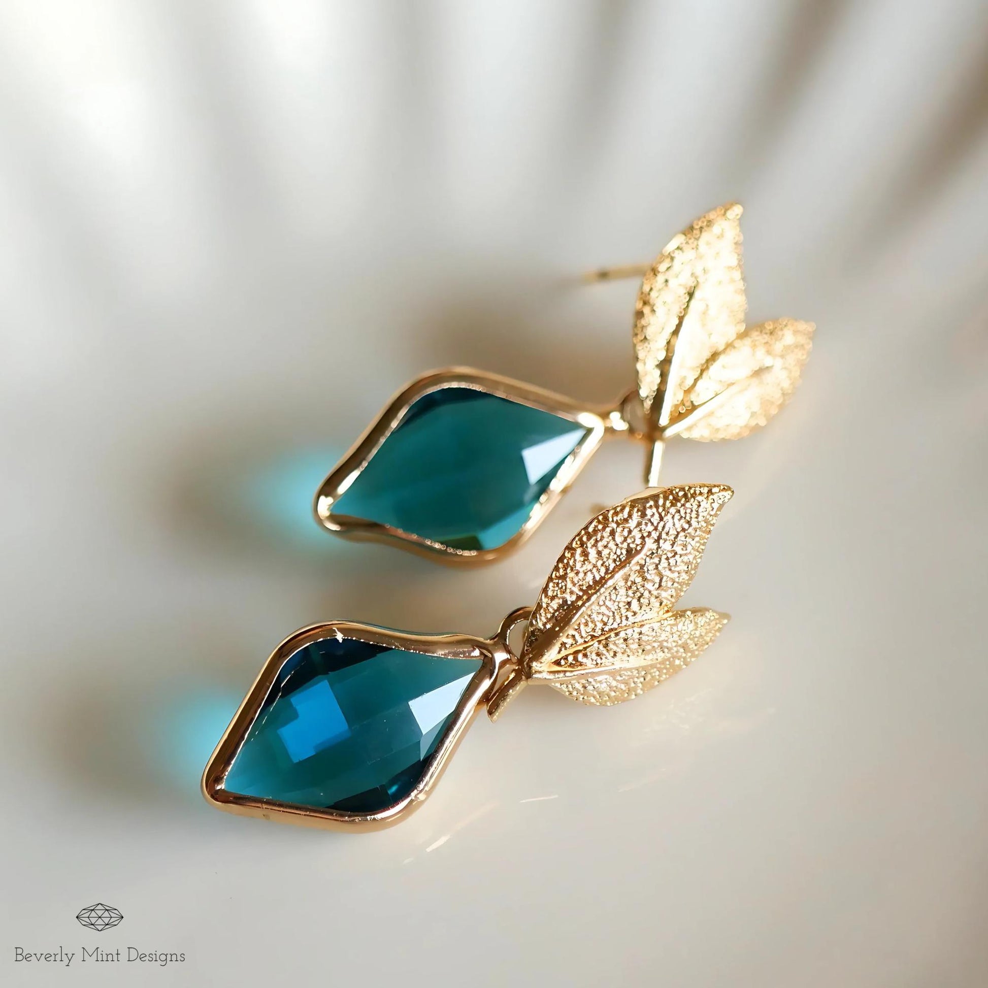 Gold Leaf Earrings, Blue Gemstone Dangle Earrings, Nature-Inspired Jewelry for Women, Something Blue Earrings