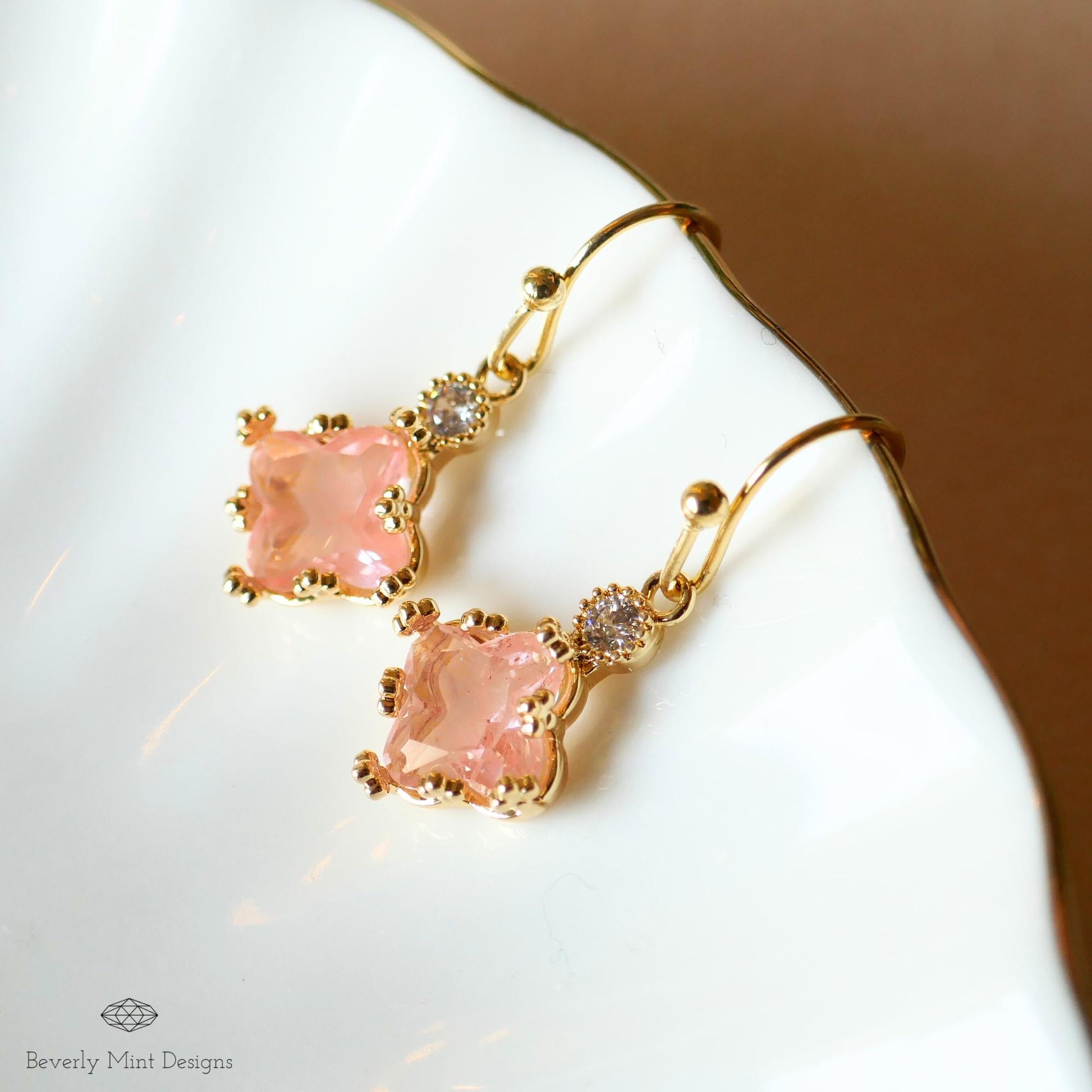 Gold Pink Crystal Earrings, Dainty Drop Jewelry for Women, Elegant Bridal Earrings, Lightweight Gift for Her, Minimalist Sparkly Hoops, Gift