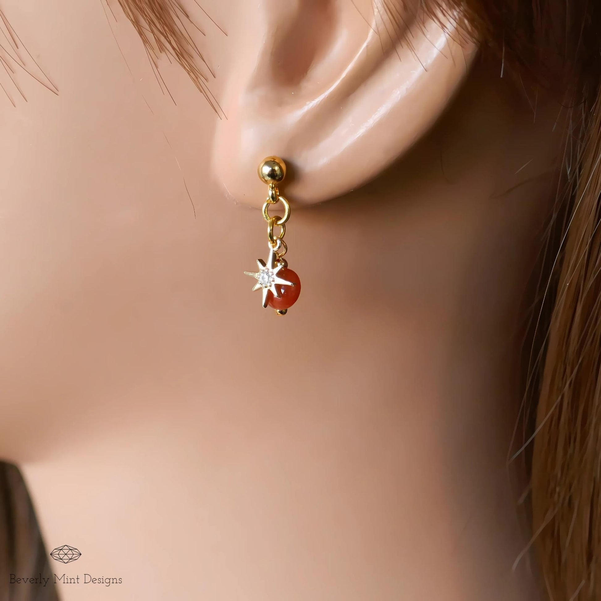 Gold Star Earrings, Minimalist Dangle Earrings, Celestial Statement Jewelry, Red Stone Dangle Earrings, Handmade Jewelry for Women