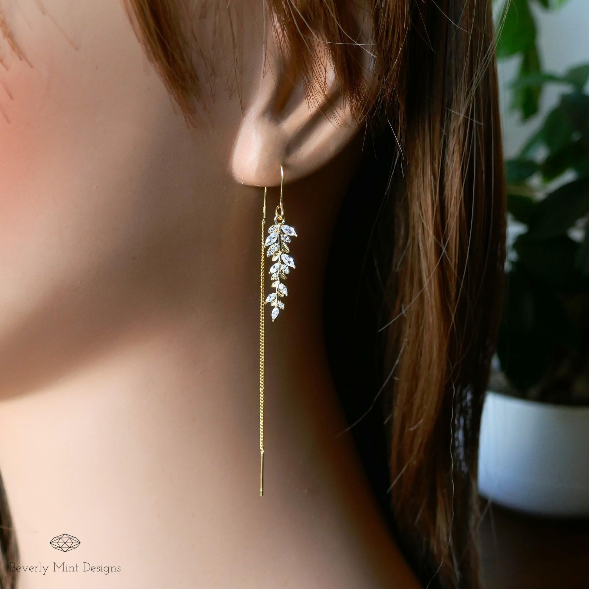 Gold Threader Earrings with Crystal Leaf Design, Sparkling Dangle Earrings with Zircon, Elegant Long Drop Earrings, Bridal Jewelry