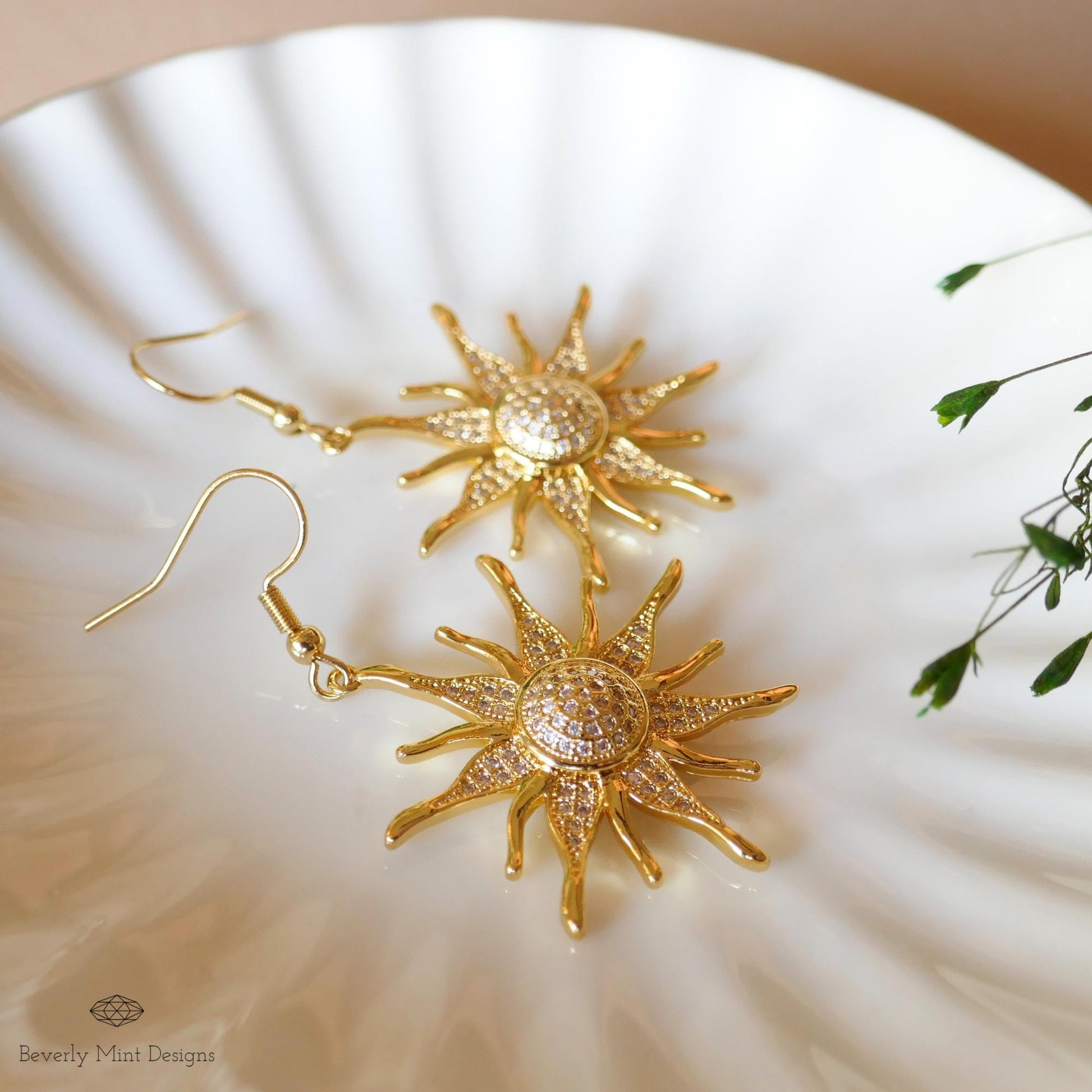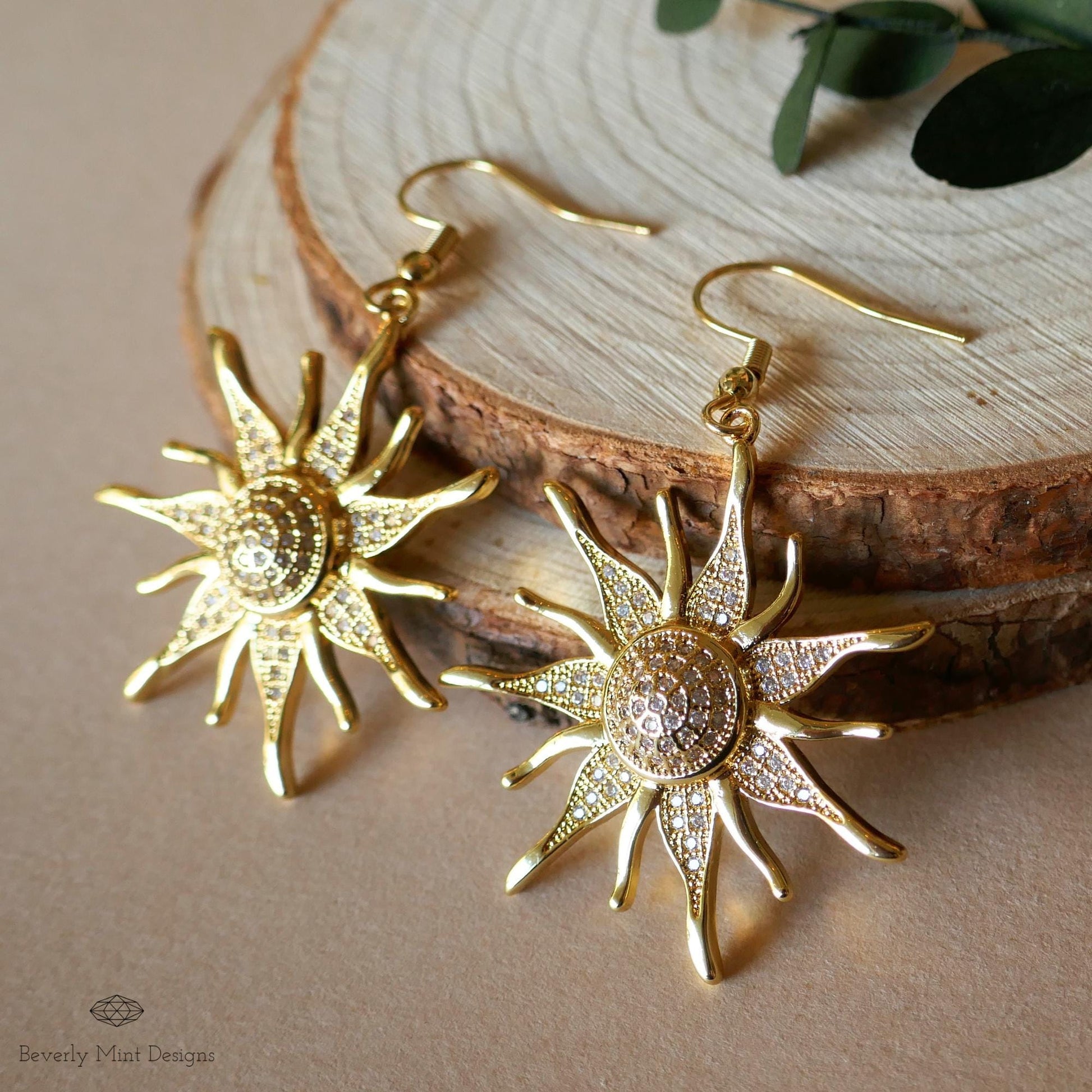 Golden Sun Earrings, 18K Gold Boho Sun Earrings, Bohemian Style Earrings, Gold Sunburst Earrings, Bohemian Zircon Jewelry, Gift For her