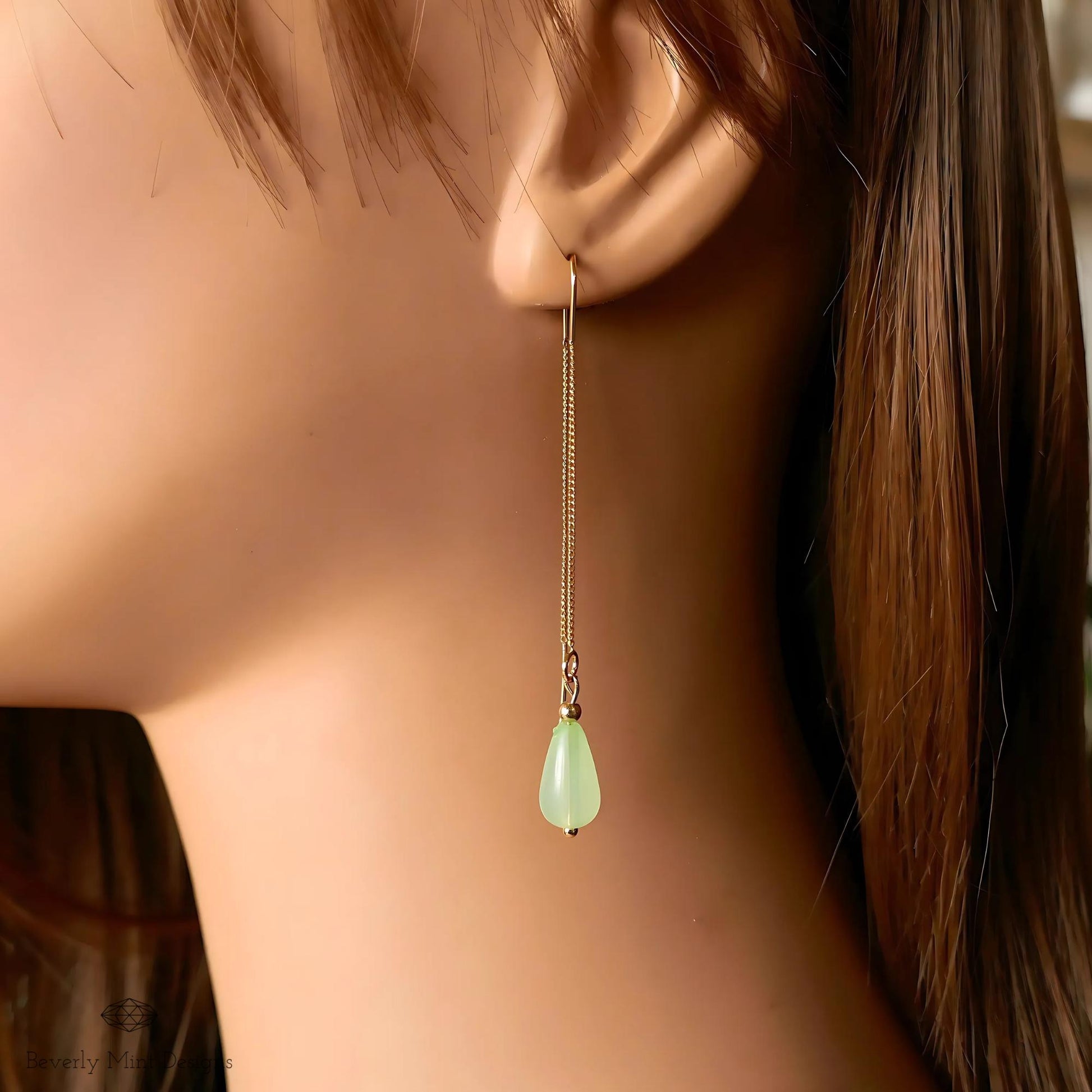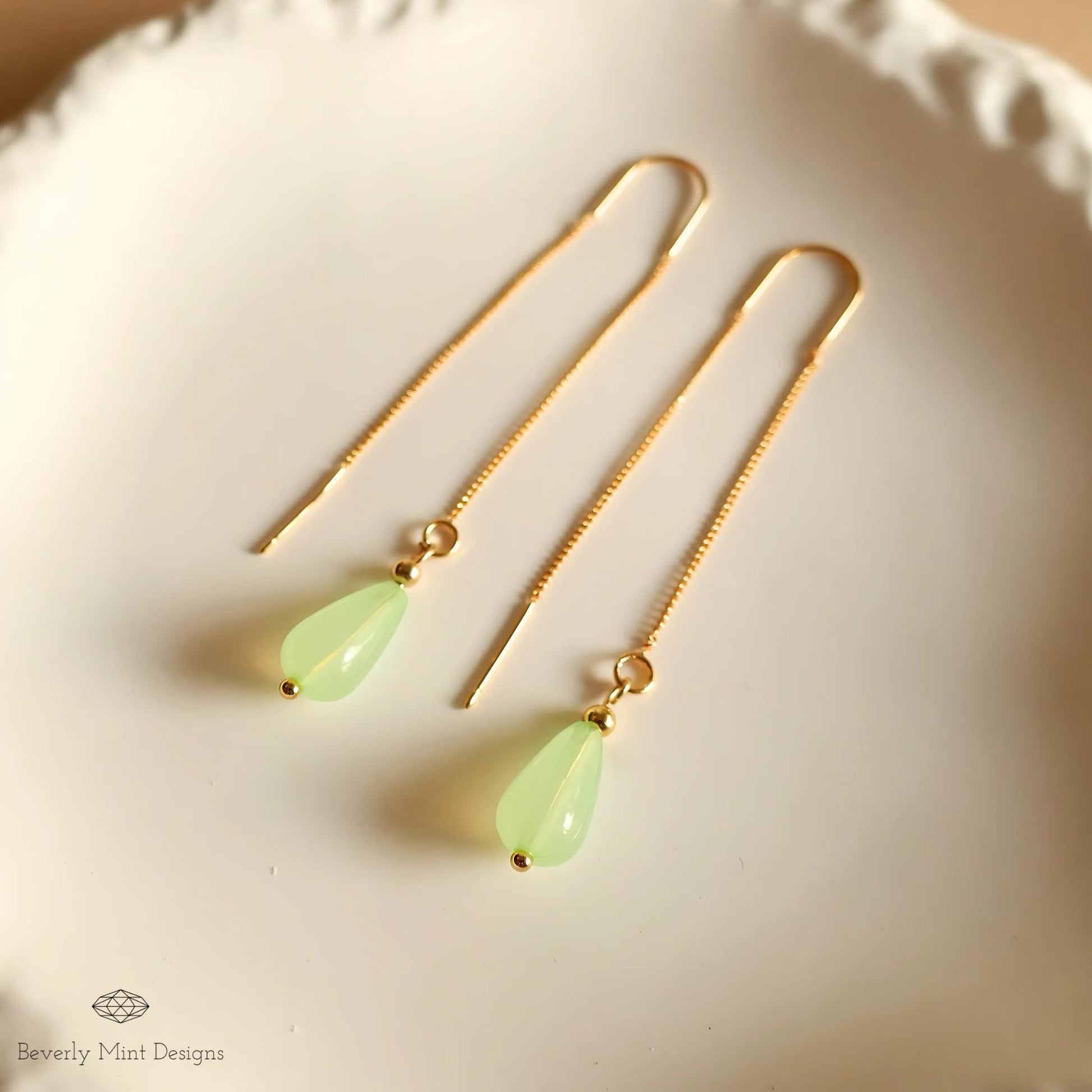 Jade Color Teardrop Earrings, Gold Threader Earrings, Green Teardrop Dangle Earrings, Minimalist Long Chain Earrings, Lightweight