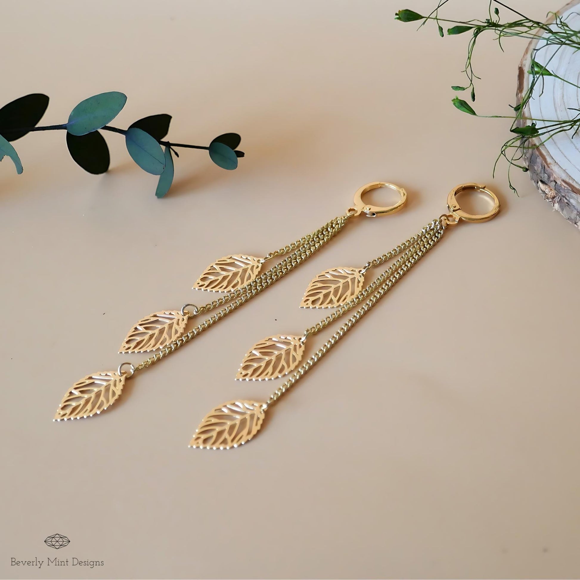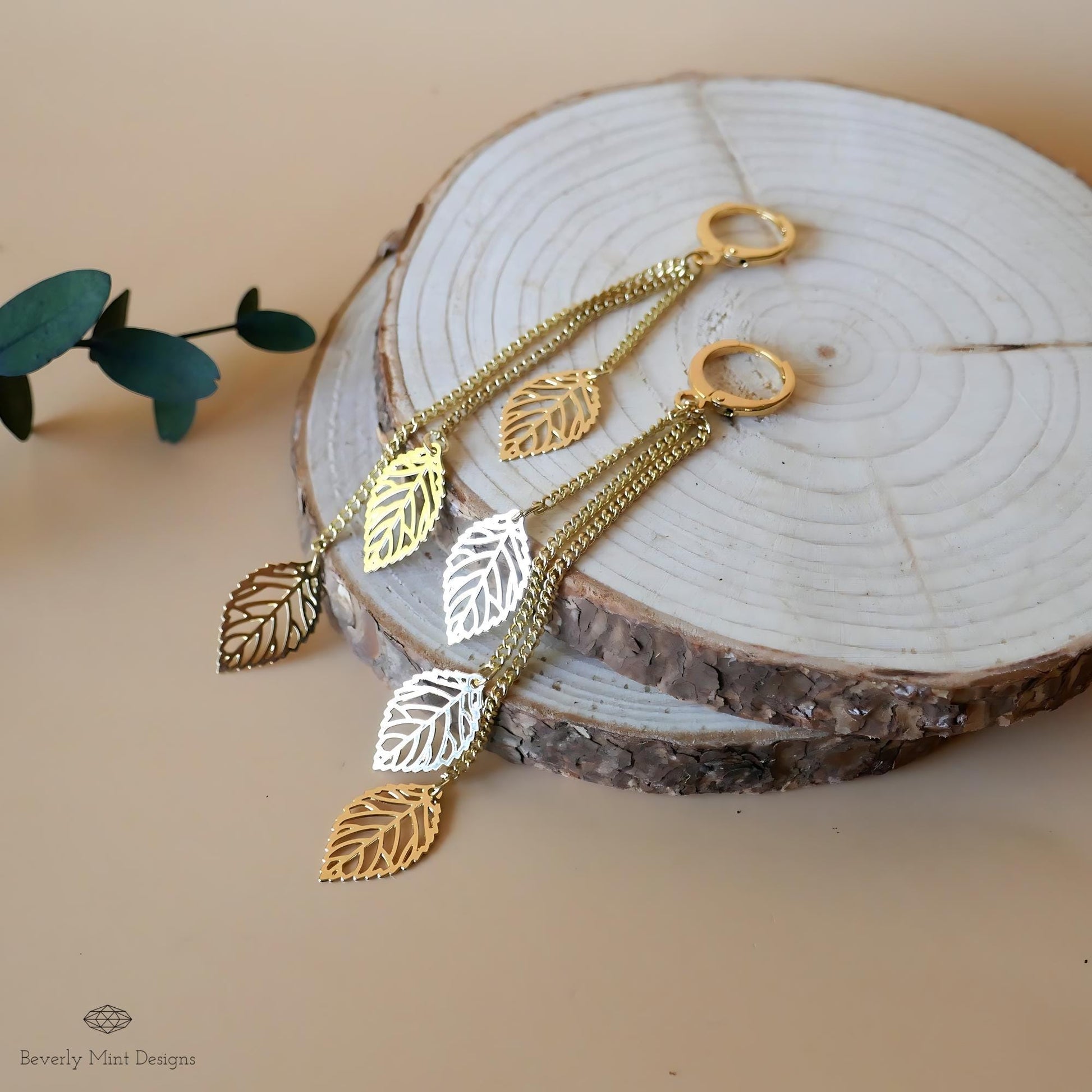 Leaf Earrings, Golden Leaves Drop Earrings, Threader Earrings, Long Boho Earrings, Lightweight Jewelry, Gift For Her