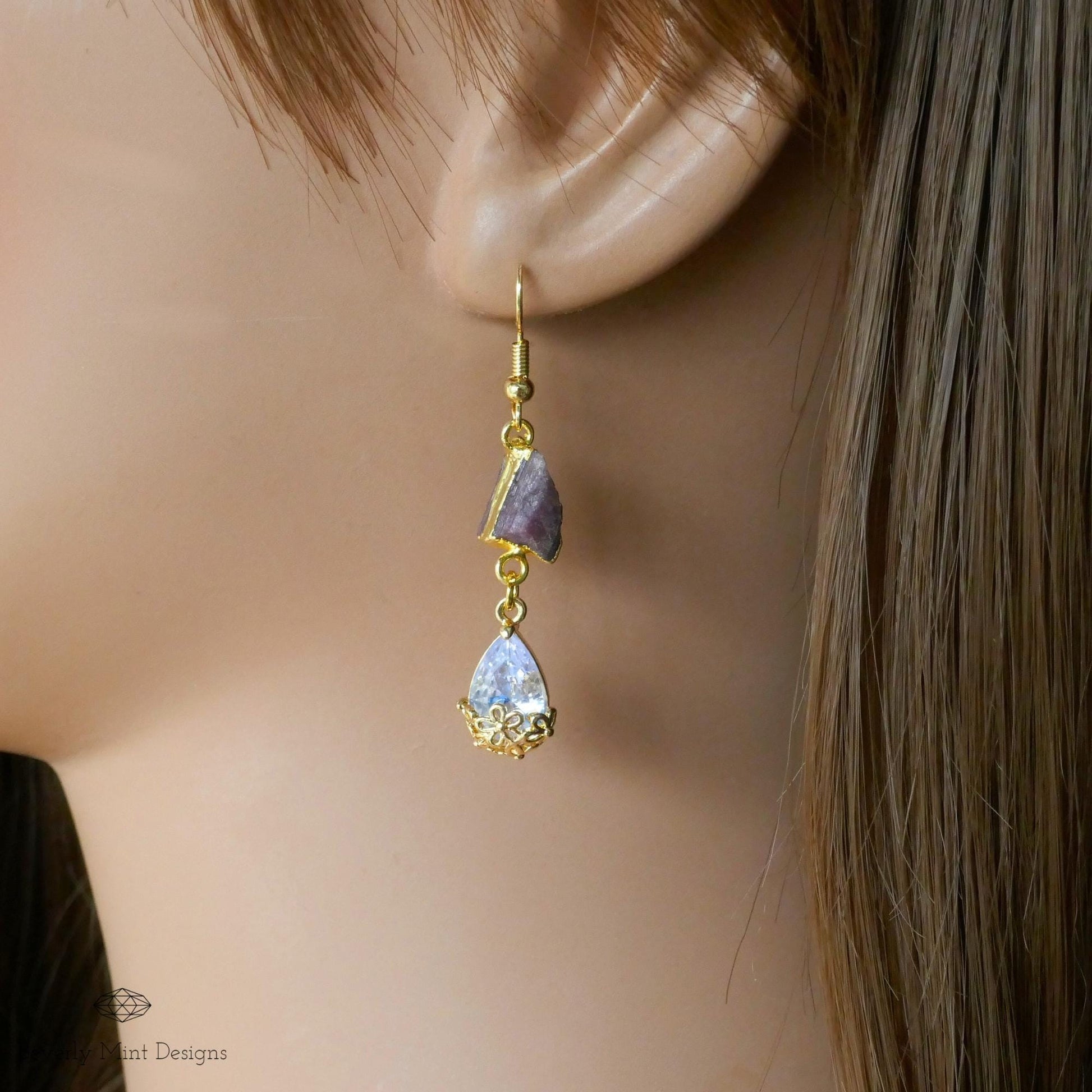 Pink Tourmaline Raw Stone Earrings with CZ, 18K Gold Birthstone Jewelry, Raw Stone Earrings, Chakra , Blue Earrings , October Birthstone