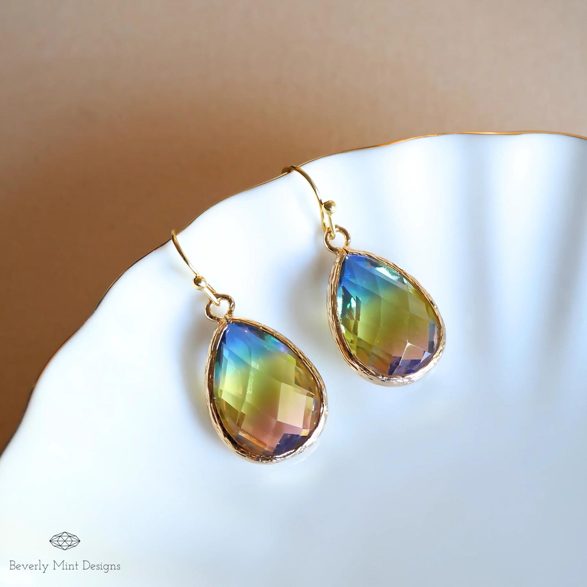 Rainbow Crystal Drop Earrings for Women, Ombre Teardrop Dangle Earrings in Gold . Colorful Teardrop Earrings, Party Jewelry, Gift For Her