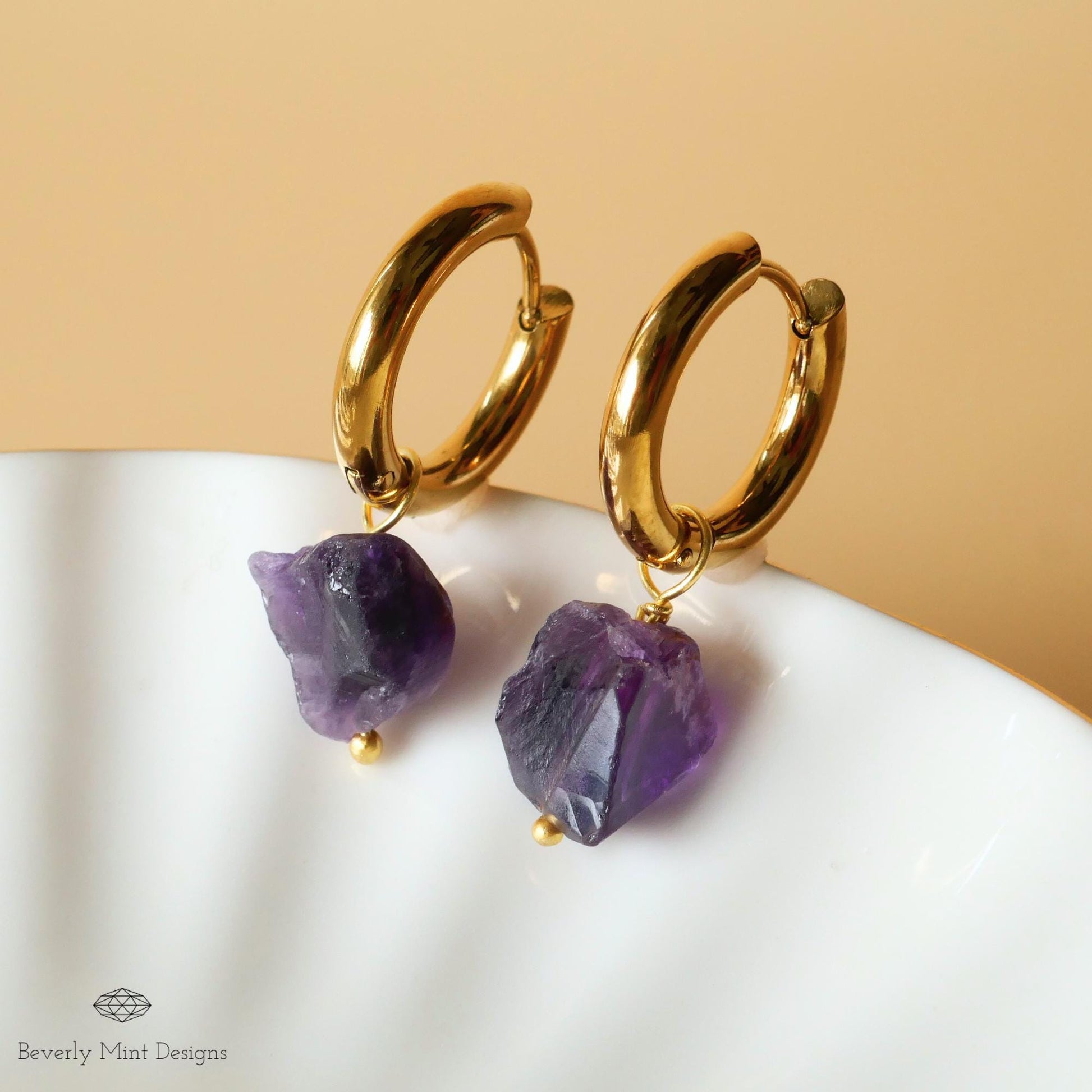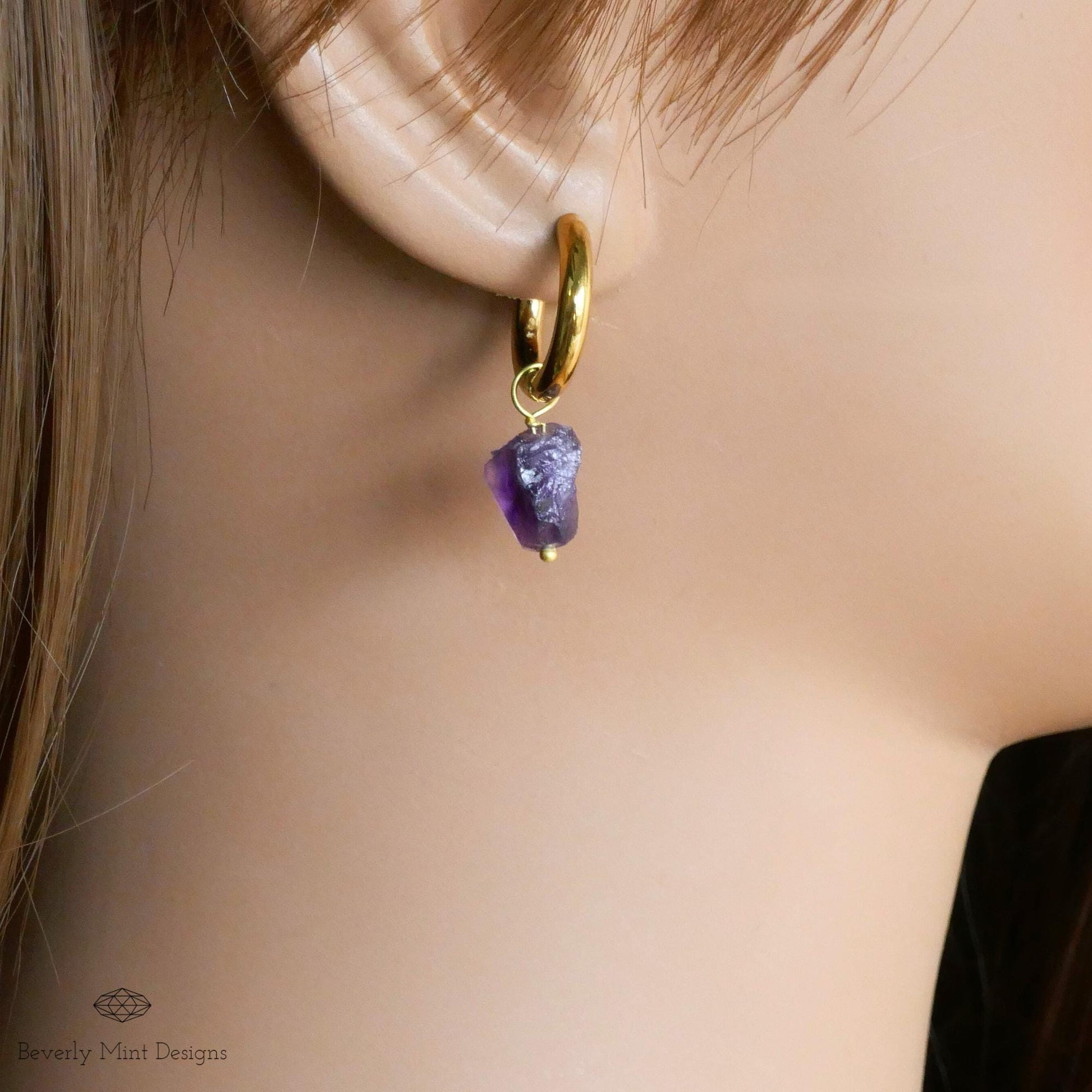 Raw Amethyst Earrings, Purple Raw Stone Earrings, 18K Gold Huggie Hoop Earrings with February Birthstone, Purple Earrings, Chakra Stone Gift