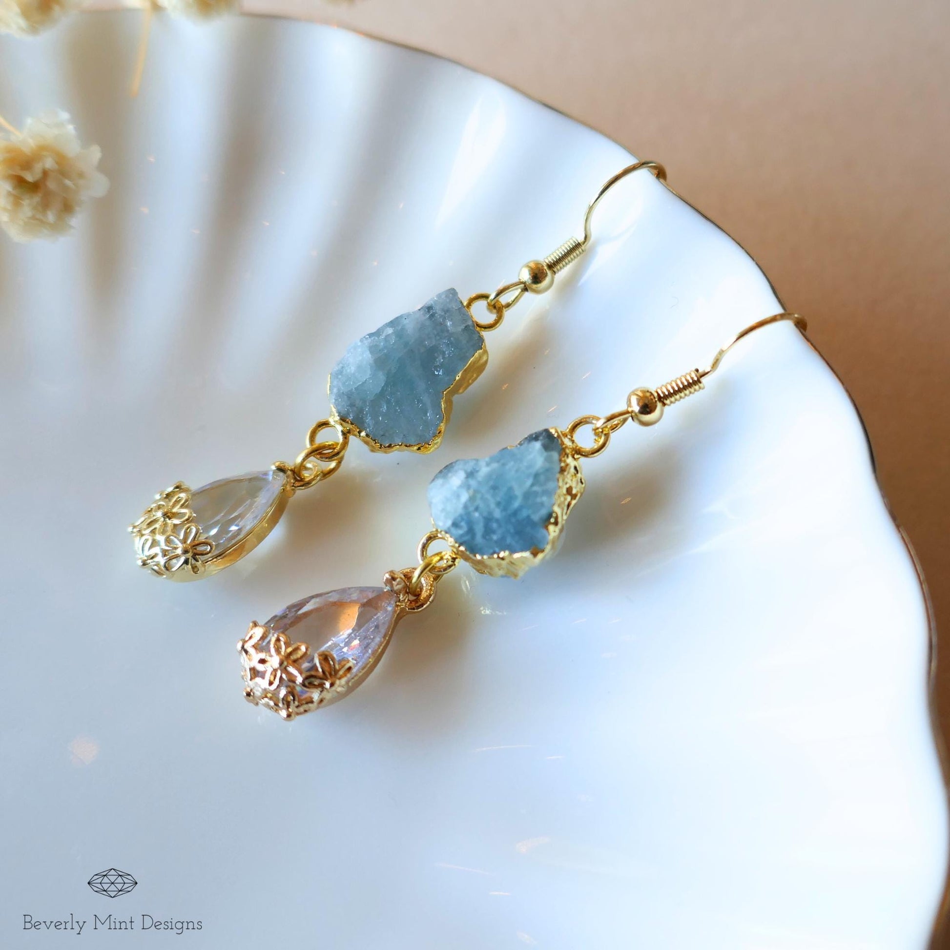 Raw Aquamarine Earrings, Blue Crystal Drop Earrings, Gold Dangle Earrings, March Birthstone Jewelry, Boho Bridal Earrings, Gift for Her