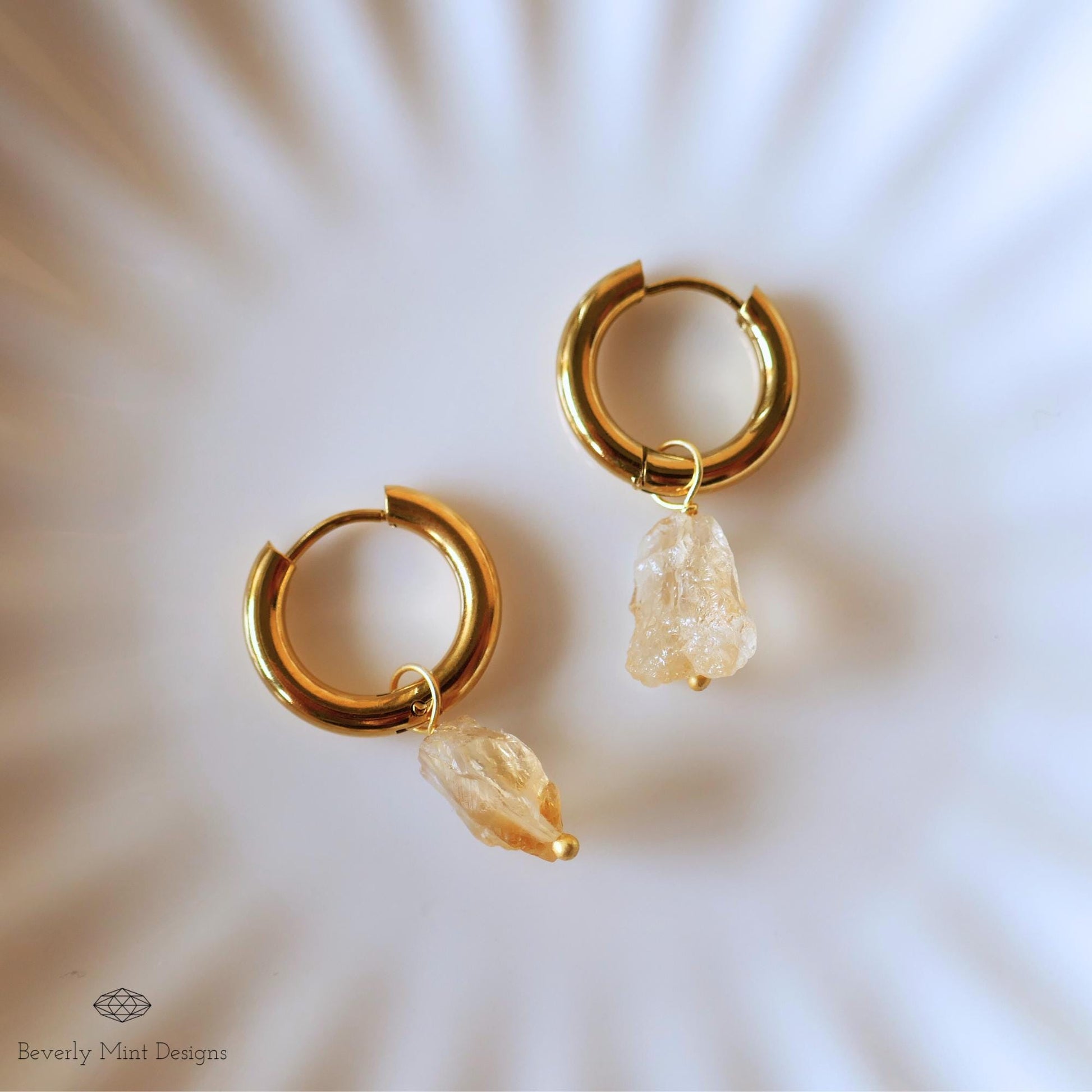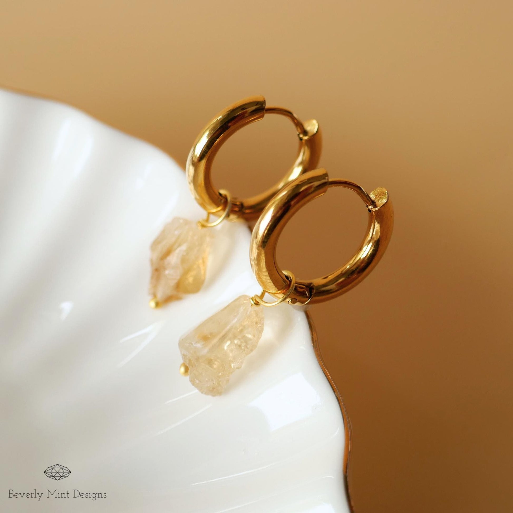 Raw Citrine Stone Earrings, 18K Gold Huggie Hoop Earrings with November Birthstone, Yellow Stone Earrings ,Chakra Stone , Gift
