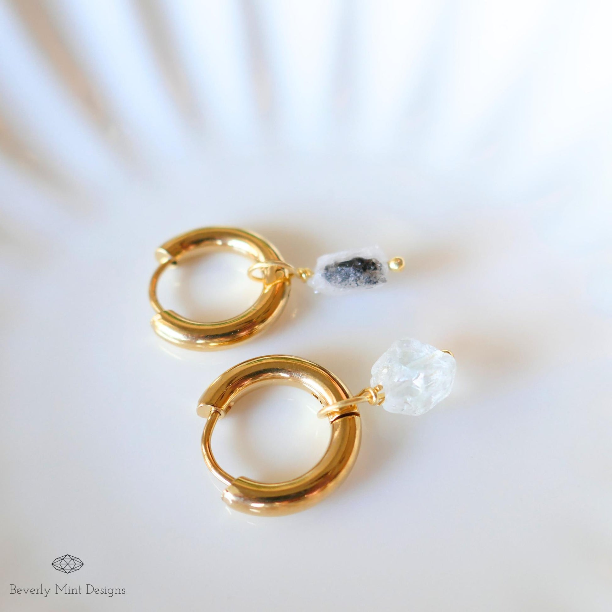Raw Herkimer Diamond Earrings, Clear Raw Stone Earrings, 18K Gold Huggie Hoop Earrings with April Birthstone, Chakra Stone for Gift