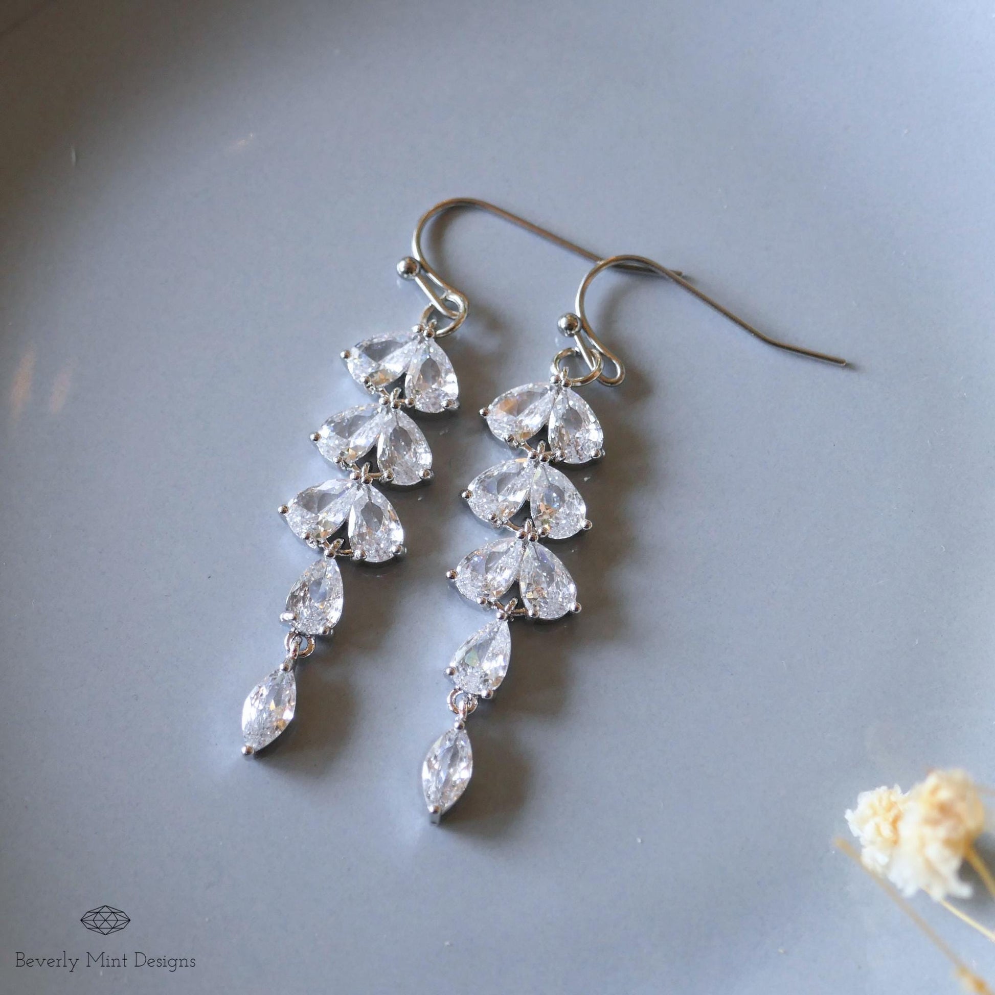 Silver Leaf Crystal Dangle Earrings, Bridal Statement Jewelry, Long Drop Sparkling Earrings, Elegant Wedding Earrings, Gift For Her