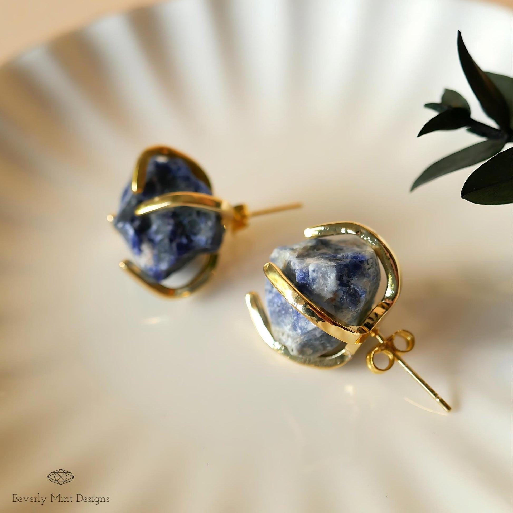 Sodalite Stud Earrings with 18K Gold, Blue Stone Earrings, 1/2 -3/4 inches, Natural Raw Stone Earrings, Chakra Stones, Gift For Her