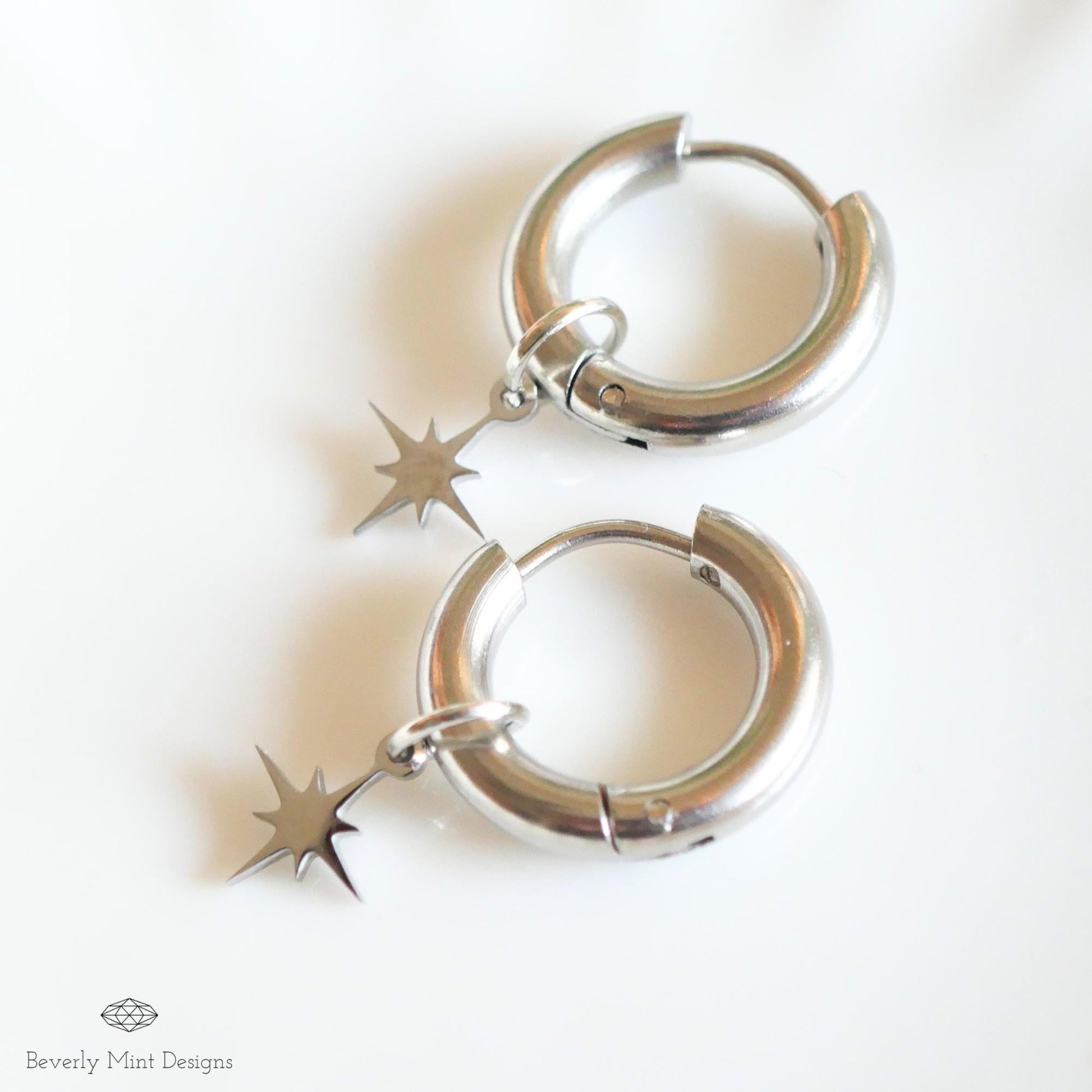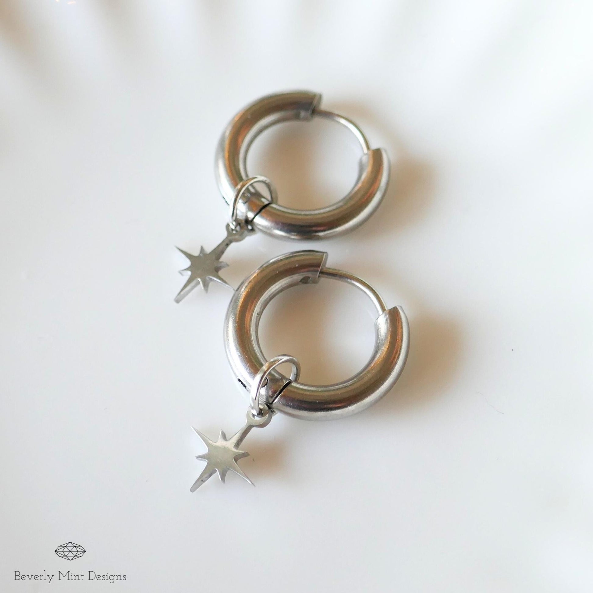 Starburst Stud Earrings, Silver Star Huggie Hoop Earrings, Minimalist Dangle Hoops for Women , Celestial Jewelry, Dainty Star Charm Earrings