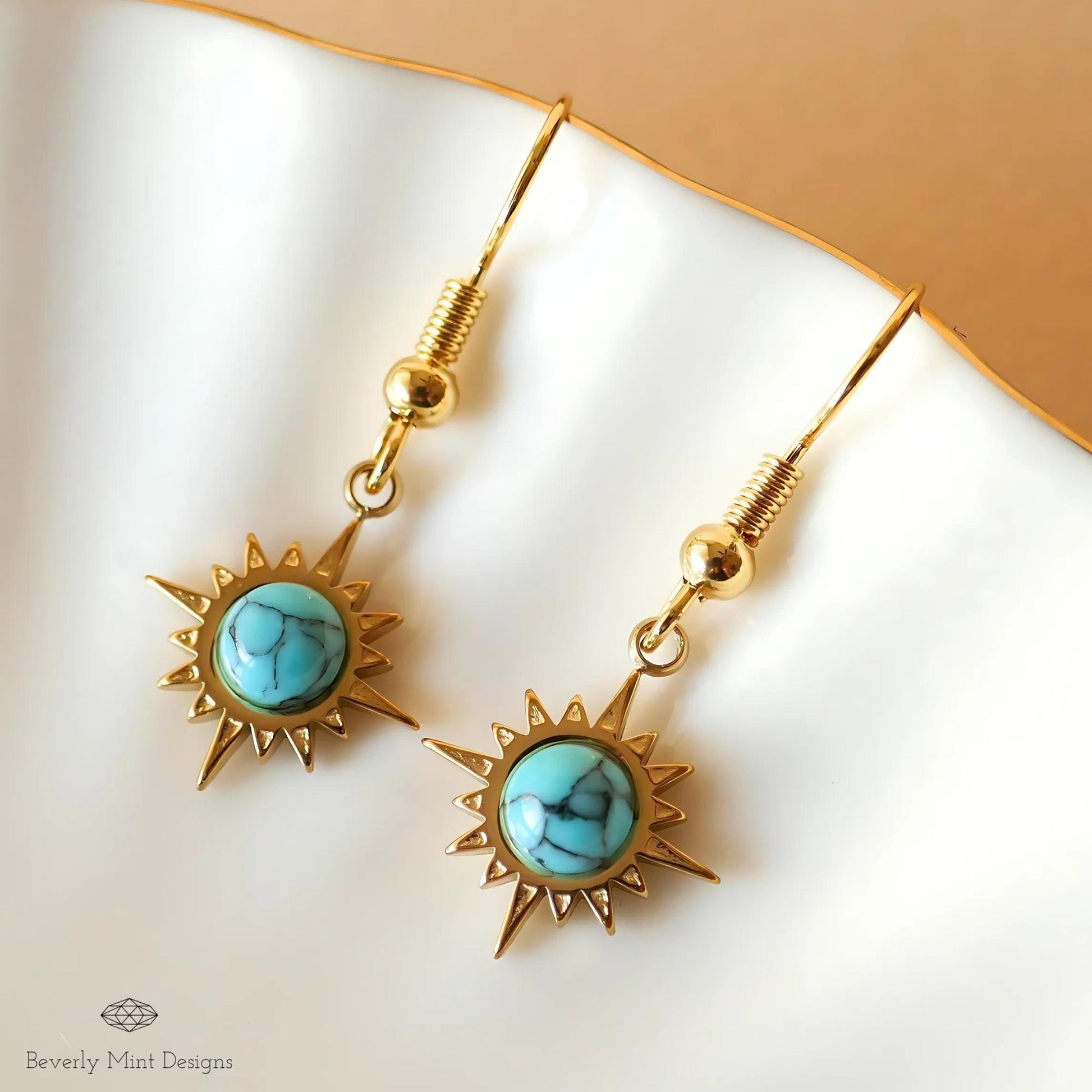 Sun Earrings ,Boho Sun Earrings 18K Gold Plated Small Earrings, Turquoise Blue Earrings , Boho Style Earrings , Gold Sunburst Earrings